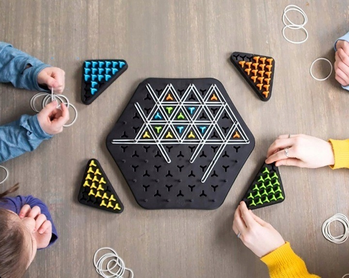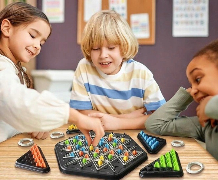 ➕ Цель TRIGGLE (Цепная игра) — растянуть резинки на колышках, замкнуть треугольники и пометить их своими фигурами таким образом, чтобы перехитрить противников и набрать как можно больше очков.
