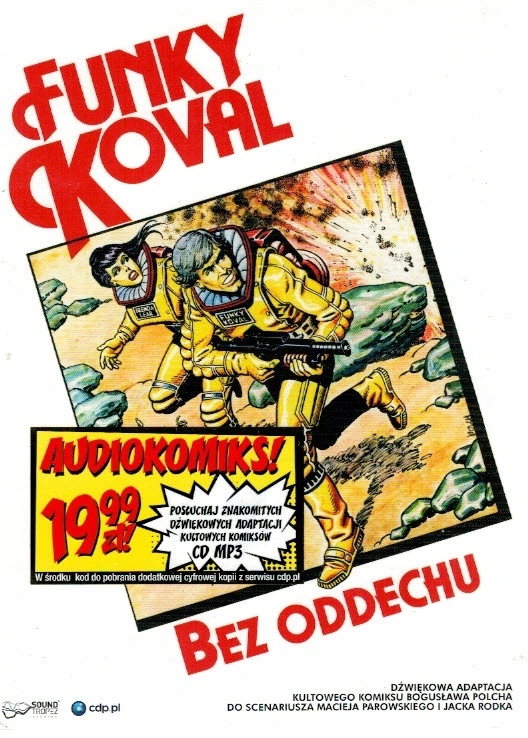 - Описание: «Funky Koval», один из лучших польских комиксов Мацея Паровского, Яцека Родека и художника Богуслава Польха. Адаптация культового комикса 1980-х годов включает в себя первый альбом серии «На последнем дыхании». Эрик Любош исполнил роль ветерана войны, который с помощью своих друзей из частного детективного агентства «Универсс» борется с международными корпорациями и двуличными инопланетянами. Остальные роли исполнят Анна Дерешовская, Мария Северин, Збигнев Конопка и Мариуш Бонашевский. Sound Tropez — комплекс современных студий звукопроизводства и пост-продакшена, а также издатель и продюсер радиопостановок и аудиокниг. Студия специализируется на создании радиоспектаклей по мотивам комиксов, на данный момент выпустила две части «Ходячие мертвецы», «Конан-варвар» и «Торгал».