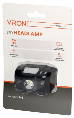 Налобный фонарь бренда VIRONE с белыми диодами и двумя дополнительными красными – еще одно предложение для тех, кто знает, что делать со своими руками и не хочет использовать их в качестве источника света. Модель имеет 5 режимов работы: 100% белый свет, 50% белый свет, красный свет, режим стробоскопа, SOS. Это идеальное снаряжение для пеших прогулок, езды на велосипеде или роликовых коньках. Нам также будет легче гулять с нашим питомцем в сумерках. Налобный фонарь CREE LED также поможет нам во время мелкого ремонта, реконструкции или профессиональной работы – словом, он будет полезен везде, где нам нужен источник света и одновременно свободные руки. Диапазон регулировки угла освещения составляет 45°. Гибкий регулируемый ремешок обеспечивает удобство использования и легко чистится. Сам фонарик также пригоден для использования на открытом воздухе и устойчив к брызгам воды (IPX3). Он генерирует световой поток 70 люмен и питается от трех батареек типа ААА (в комплект не входят) — время автономной работы составляет примерно 3,5 часа. В фонаре используются светодиоды мощностью 3 Вт.