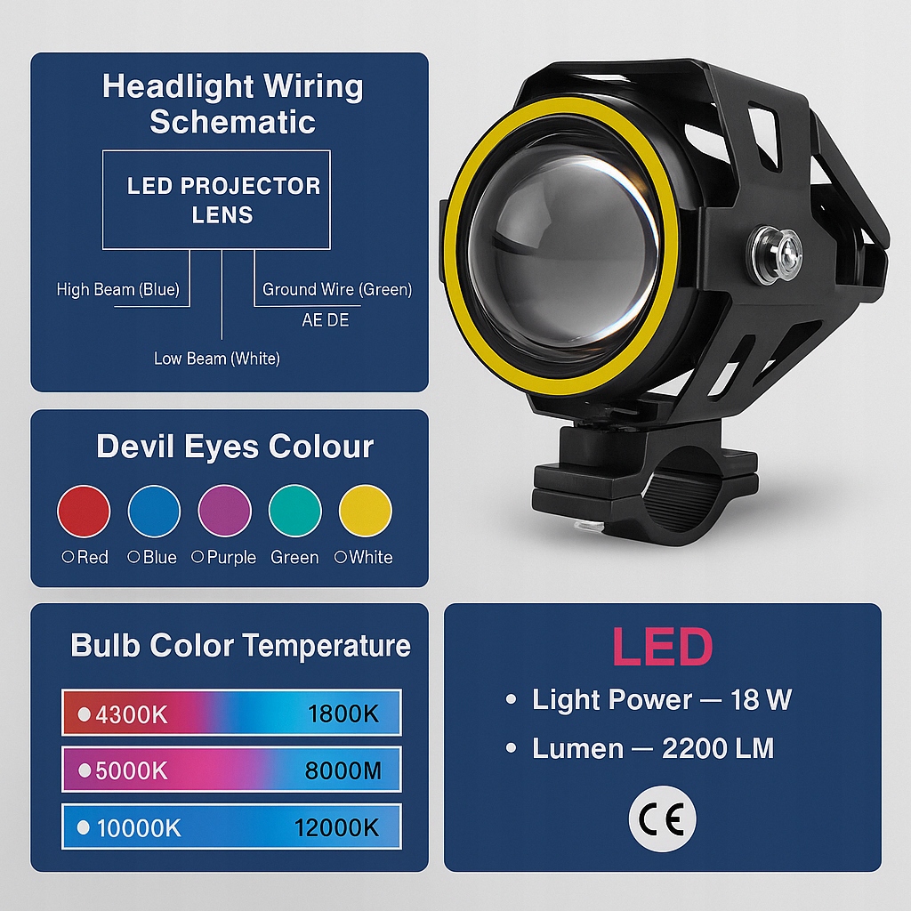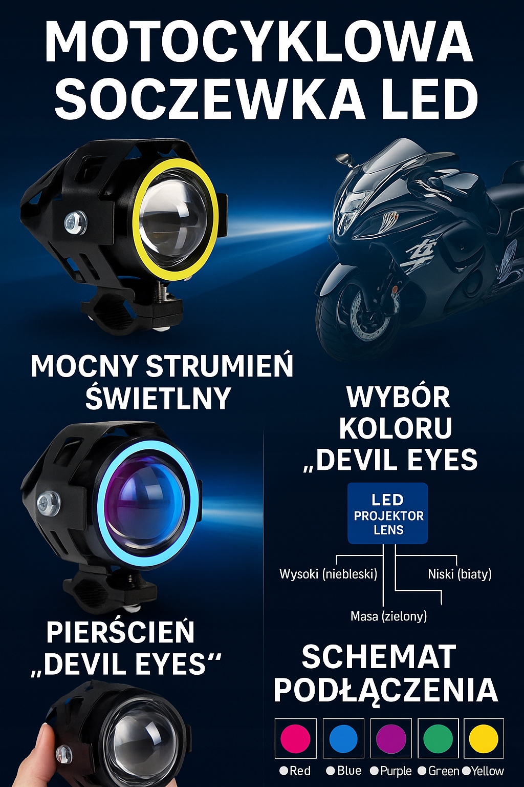 Универсальная светодиодная фара с линзой проектора со встроенным эффектом Devil Eyes. Этот современный источник света будет хорошо работать на мотоциклах, скутерах, квадроциклах и других транспортных средствах с напряжением 12–60 В.