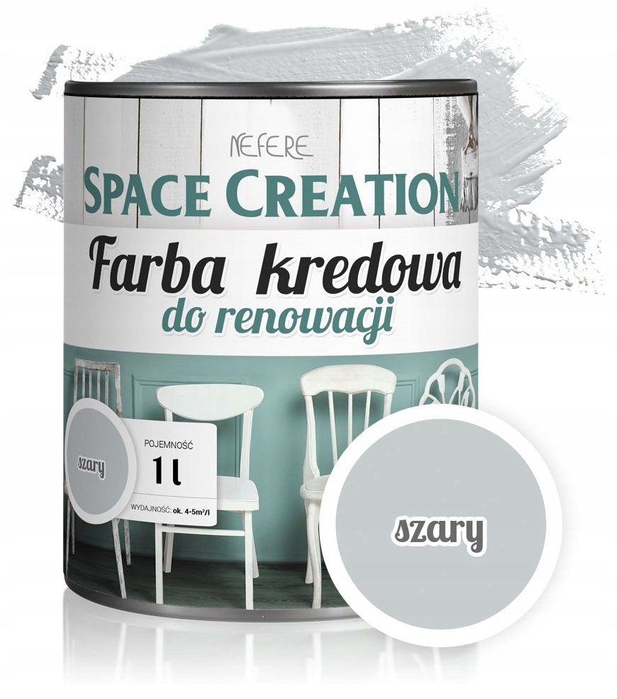 Новый продукт из линейки Space Creation. Меловая краска для ремонта – отличная идея для изменения пространства вокруг себя, тем более, что серый цвет – абсолютный хит среди современных тенденций дизайна интерьера. Вам наскучила ваша мебель? Ваш любимый комод нуждается в ремонте? А может быть, ваша мебель уже не соответствует новому цвету стен? Теперь вы легко сможете создать свое пространство с нуля, ведь это девиз Space Creation. В случае с серым или белым у вас есть дополнительное преимущество: подойдут практически все цвета фурнитуры.