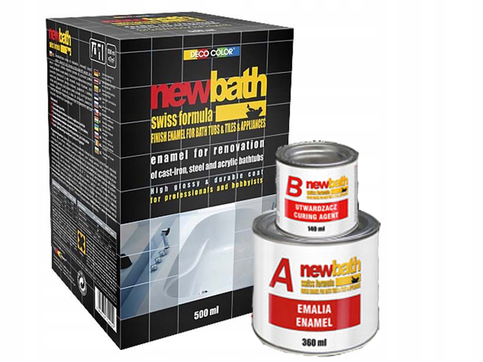 Двухкомпонентная эмаль для обновления чугунных, эмалированных и акриловых ванн. Применяется для: покраски сантехнических помещений, таких как раковины, умывальники, душевые поддоны, керамическая плитка. Может использоваться на других керамических и деревянных поверхностях, ламинированных поверхностях (лодки, яхты, самолеты), стали и алюминии, а также для покрытия пластиковых элементов. Краска предназначена для покрытия поверхностей выше и ниже ватерлинии.