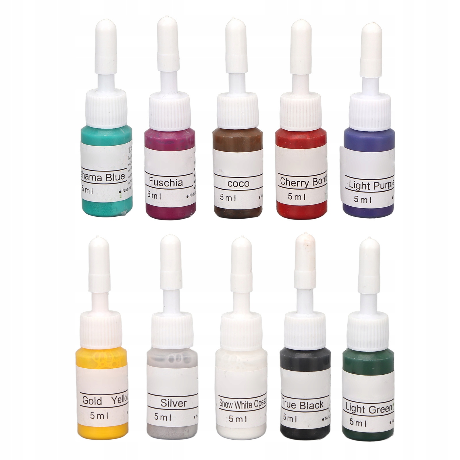 1. 10 цветов: набор чернил для татуировки из 10 различных цветов: черного, темно-зеленого, коричневого, белого, красного, фиолетового, светло-зеленого, серого, синего, оранжевого.