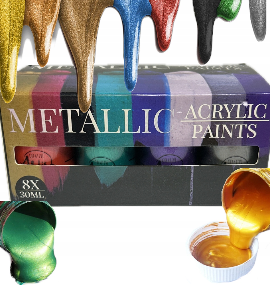 ✅ Большой набор содержит 8 флаконов акриловых красок с металлическим финишем.