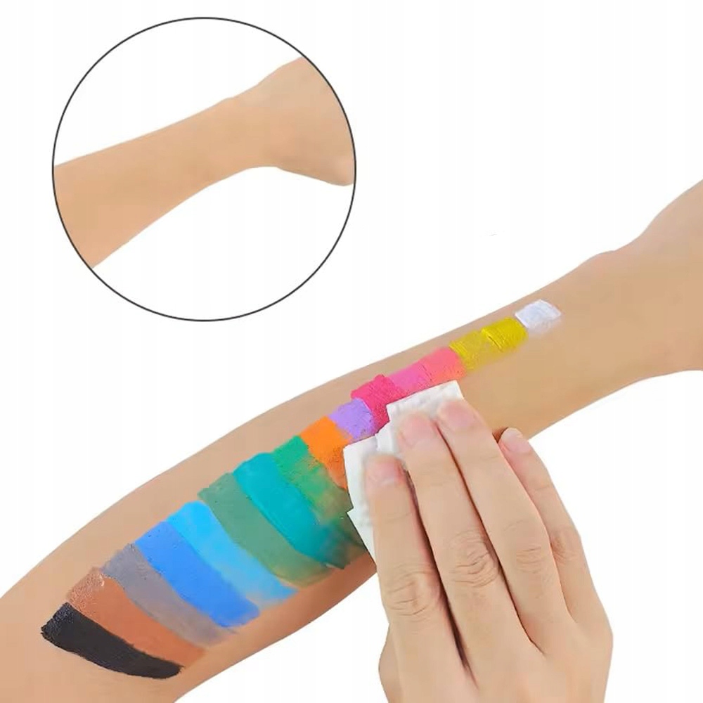 ⏺️⏺️Простота в использовании и чистке: верхний слой активируется водой. Просто добавьте несколько капель воды к желаемому цвету, чтобы получить мягкую консистенцию пасты. Равномерно нанесите его на кожу с помощью прилагаемой кисточки или губки (для больших поверхностей) и оставьте высыхать на несколько минут. Чтобы очистить его, просто используйте теплую воду, детские салфетки или очищающее средство для лица, чтобы его было легко удалить.