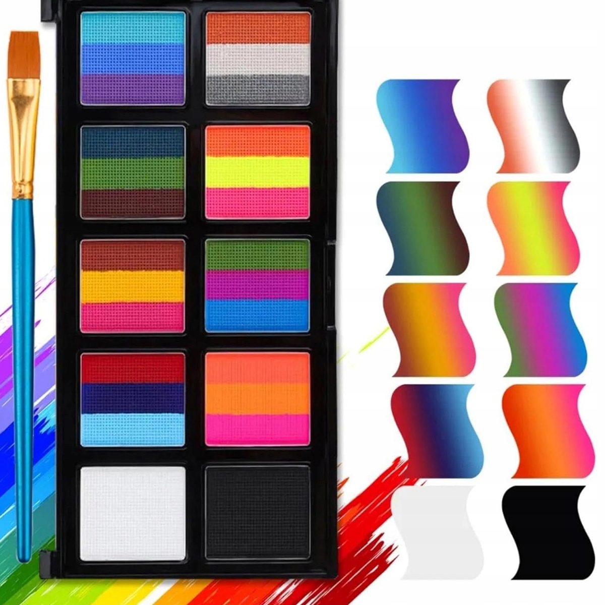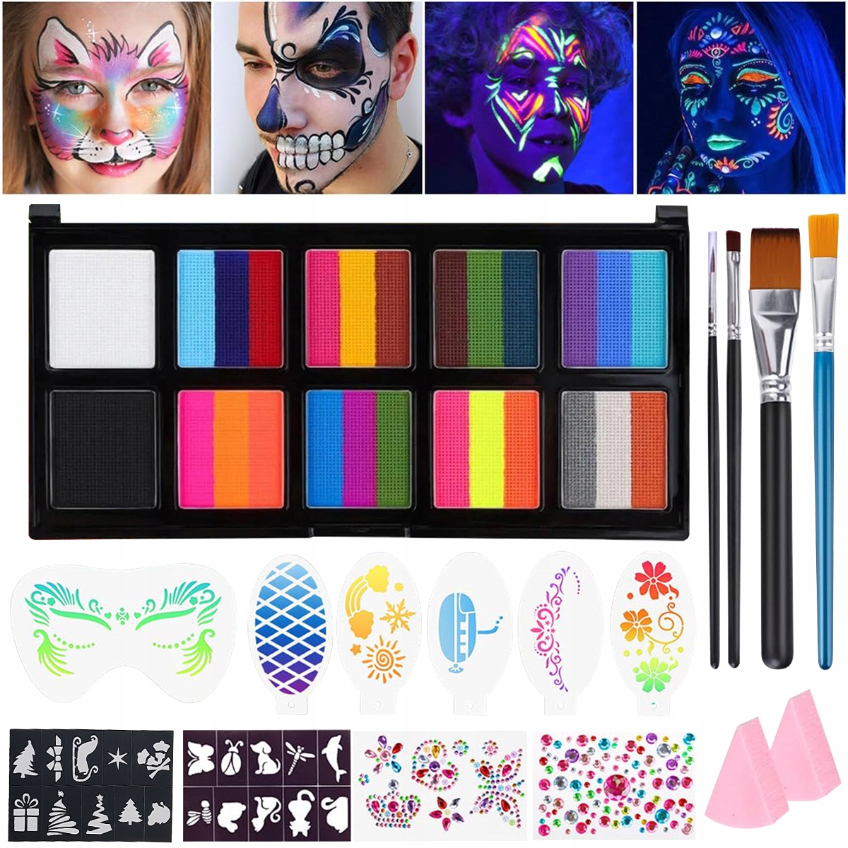 YOUKUKE Regenbogenfarben Karnevalsschminke Kinderschminke Set enthält 8 dreifarbigem Rainbow Face Paint, 1 schwarze Gesichtsfarbe, 1 weiße Gesichtsfarbe, 6 Ripple-Vorlagen, 2 Aufklebervorlagen, 2 Strassaufkleber, 4 Pinsel, 2 Schwämme и 1 Bedienungsanleitung. Lebendige Farben bieten Ihnen mehr Platz zum Malen. Краска для лица Mit der Split Cake können Sie wunderschöne Regenbogenmuster, Blumenmuster zeichnen. Теплые советы: Leuchten unter UV-Licht (außer schwarze & Weiß Gesichtsfarbe), aber nicht im Dunkeln.