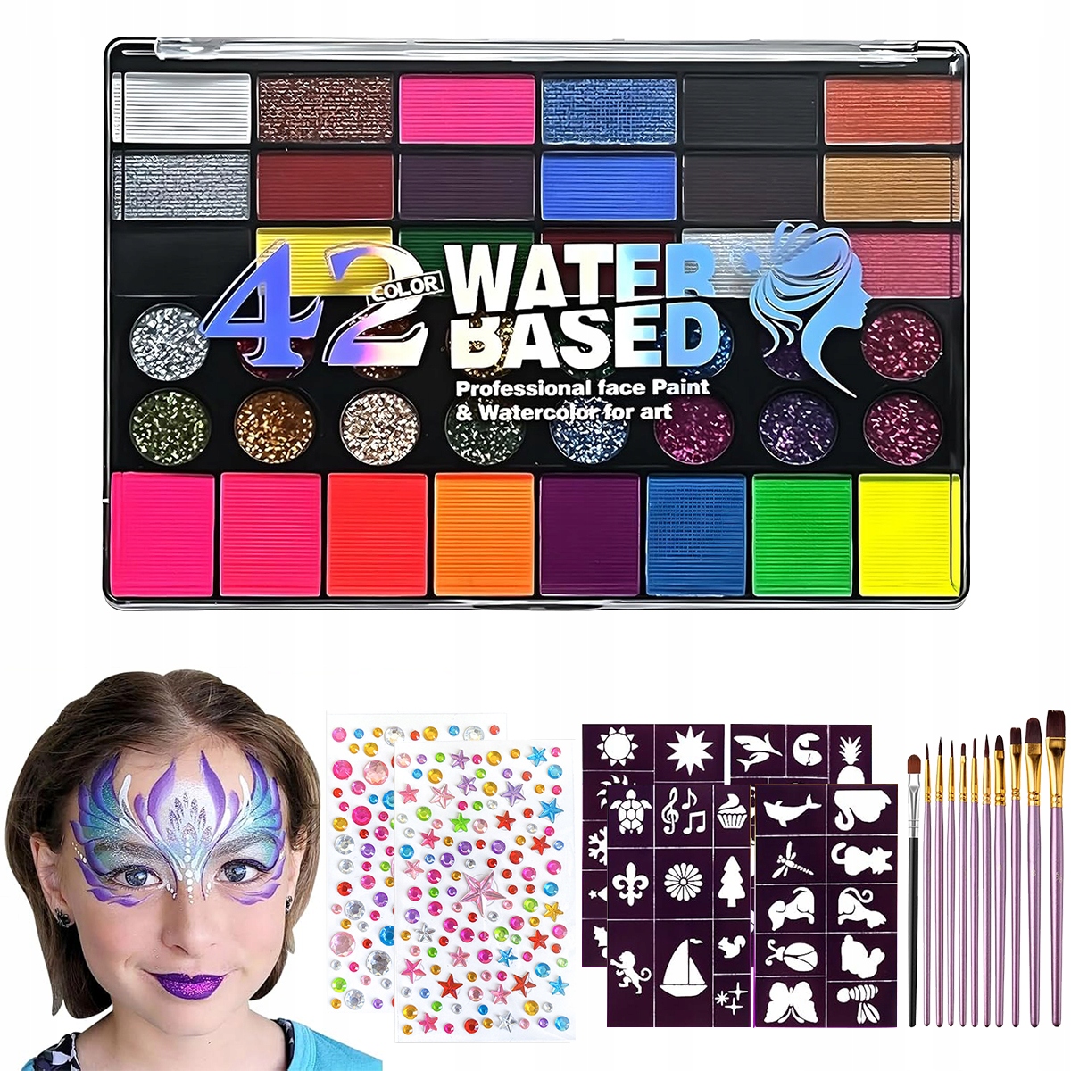 ⭕Детский набор для макияжа, краски для лица, детский набор для макияжа, палитра из 42 цветов для макияжа, 11 профессиональных кистей, 4 трафарета и 2 наклейки, грим на Хэллоуин, театральный грим, бодиарт, цвета, девочки, мальчики, взрослые⭕