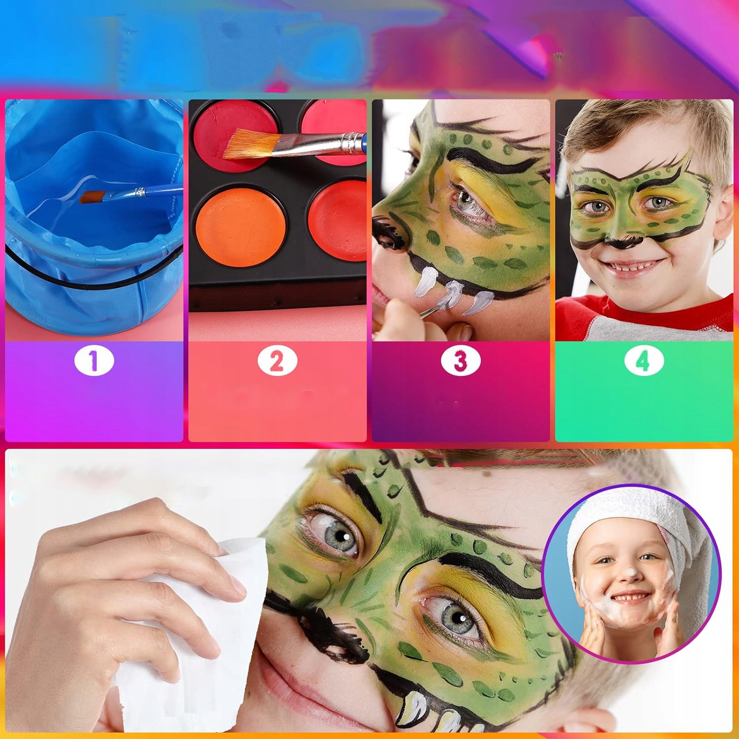 Детский макияж для детей быстро -подходит и длится много часов. Цвета на основе воды очень удобны, просто увлажняют щетку или капают немного воды, смягчайте поверхность цветов макияжа, погрузитесь в цвет и нанесите на лицо. Легко чистить влажной тканью или мылом и водой, без остатков.