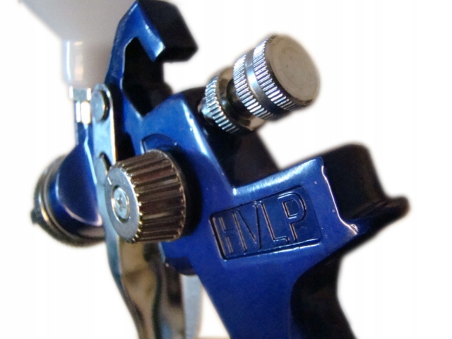 Краскораспылитель HVLP* (большой объем, низкое давление) — большой объем, низкое давление работает по принципу распыления воздуха в резервуаре с краской в облако. Сжатый воздух подается в сопло и бак с краской. Частицы распыленной краски выбрасываются в воздушную рубашку.