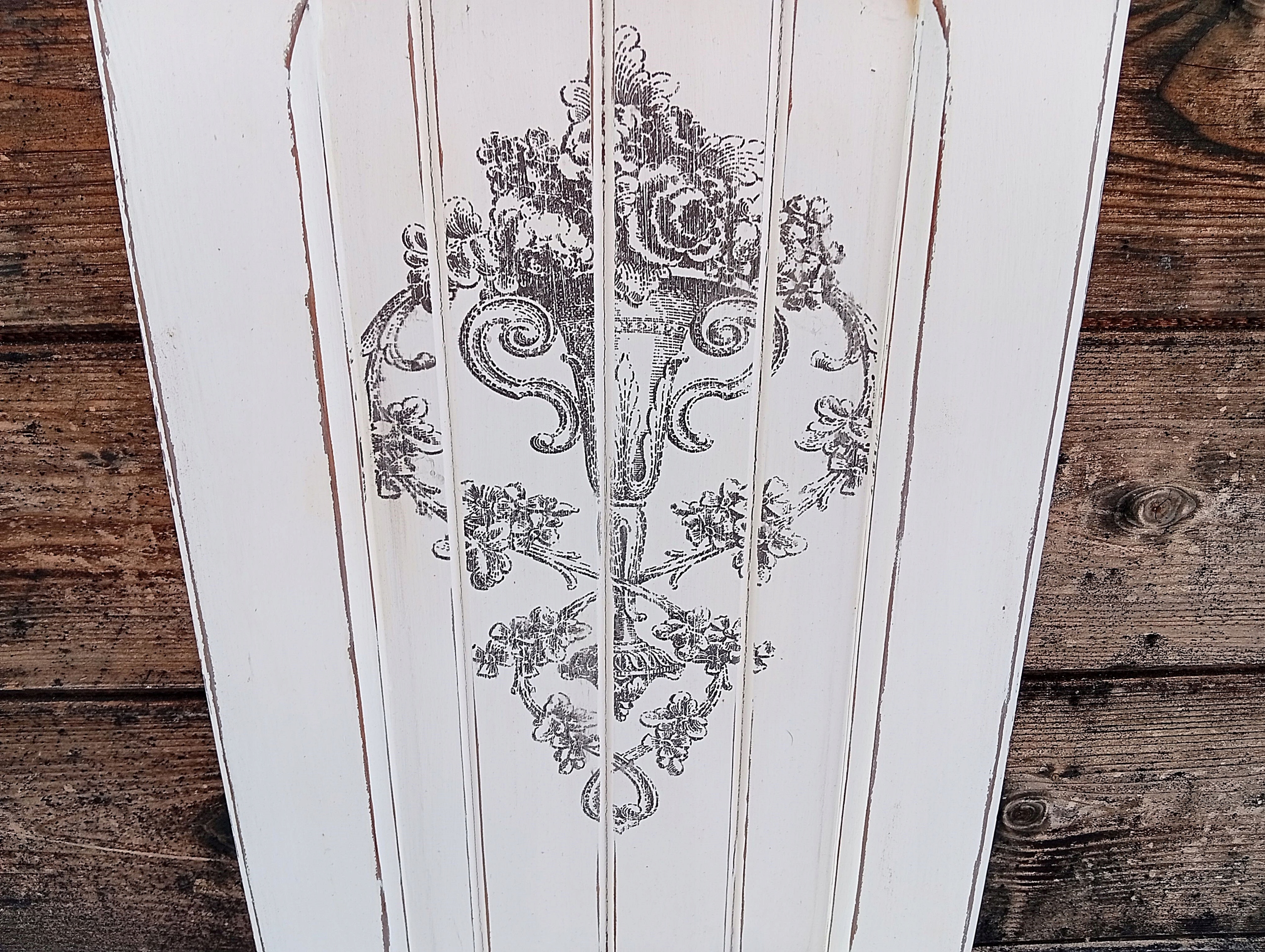 Окрашена в белый цвет, состарена, намеренно состарена, украшена графикой вручную.