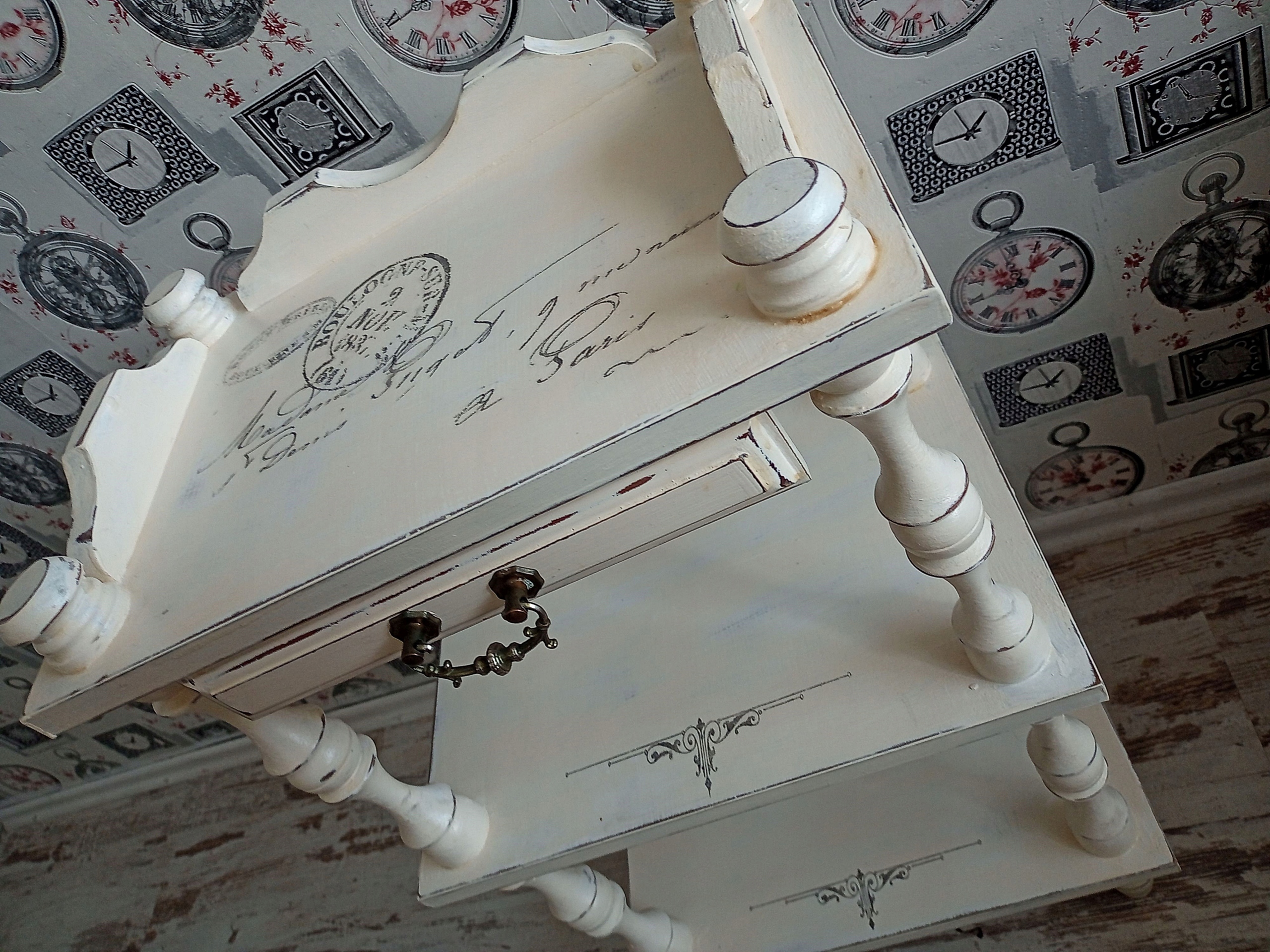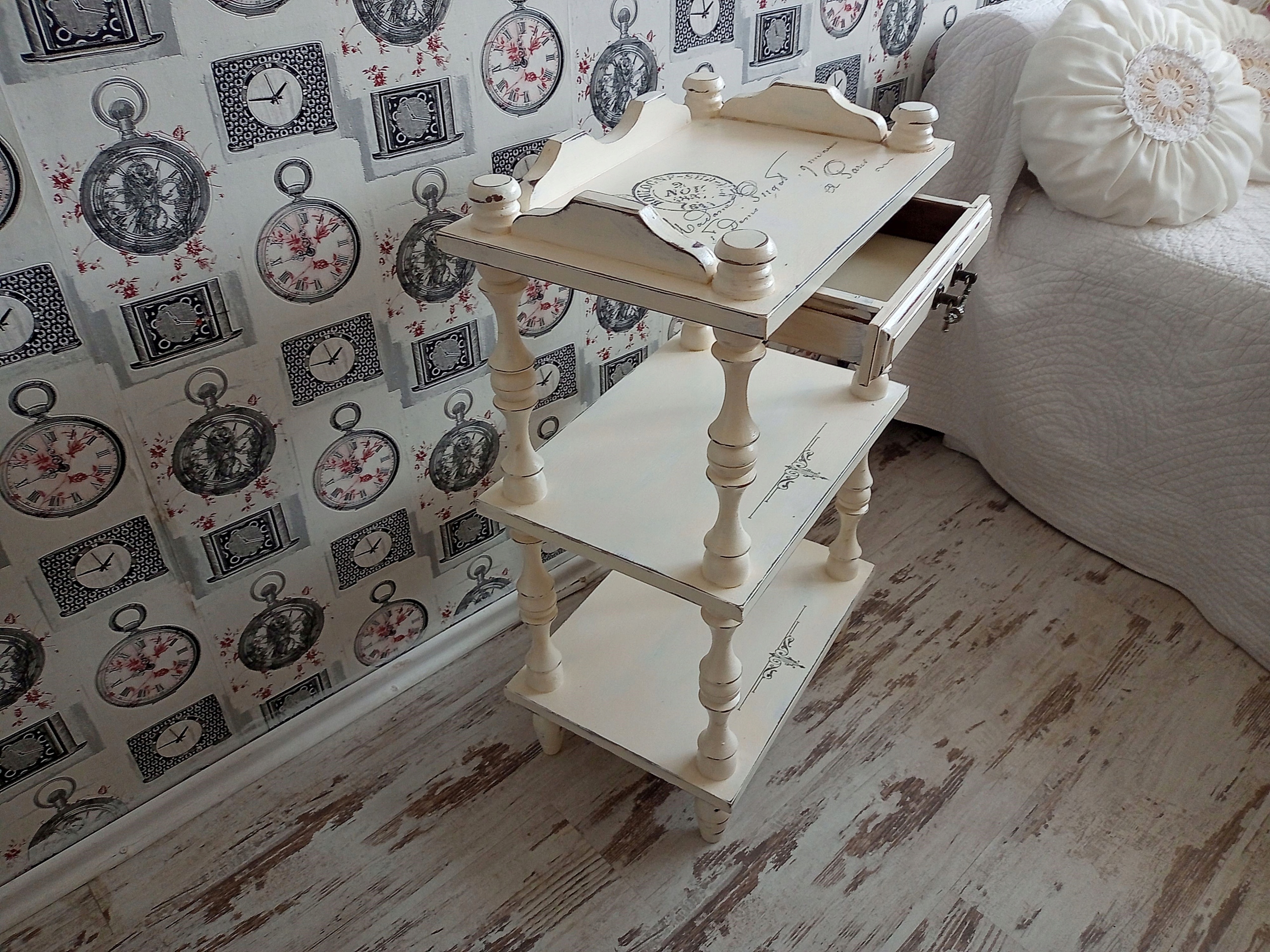 РАСКРАШЕННЫЙ ДЕРЕВЯННЫЙ СТОЛИК С ПОЛКАМИ, ШАББИ ШИК