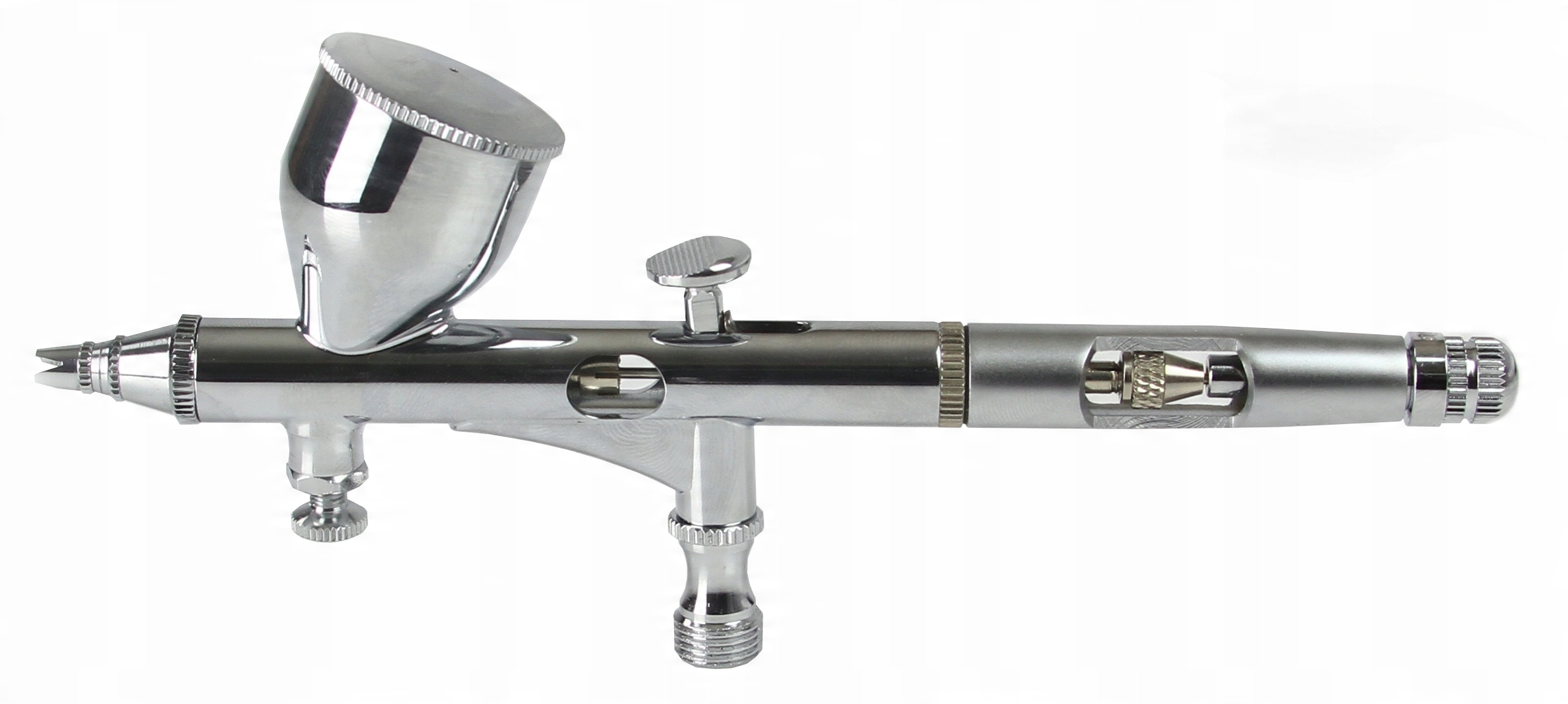- Это аэрограф двойного назначения, то есть с помощью кнопки мы регулируем как количество подаваемого воздуха (движениями вниз, так и вверх). ), а также количество краски (движения назад и вперед).