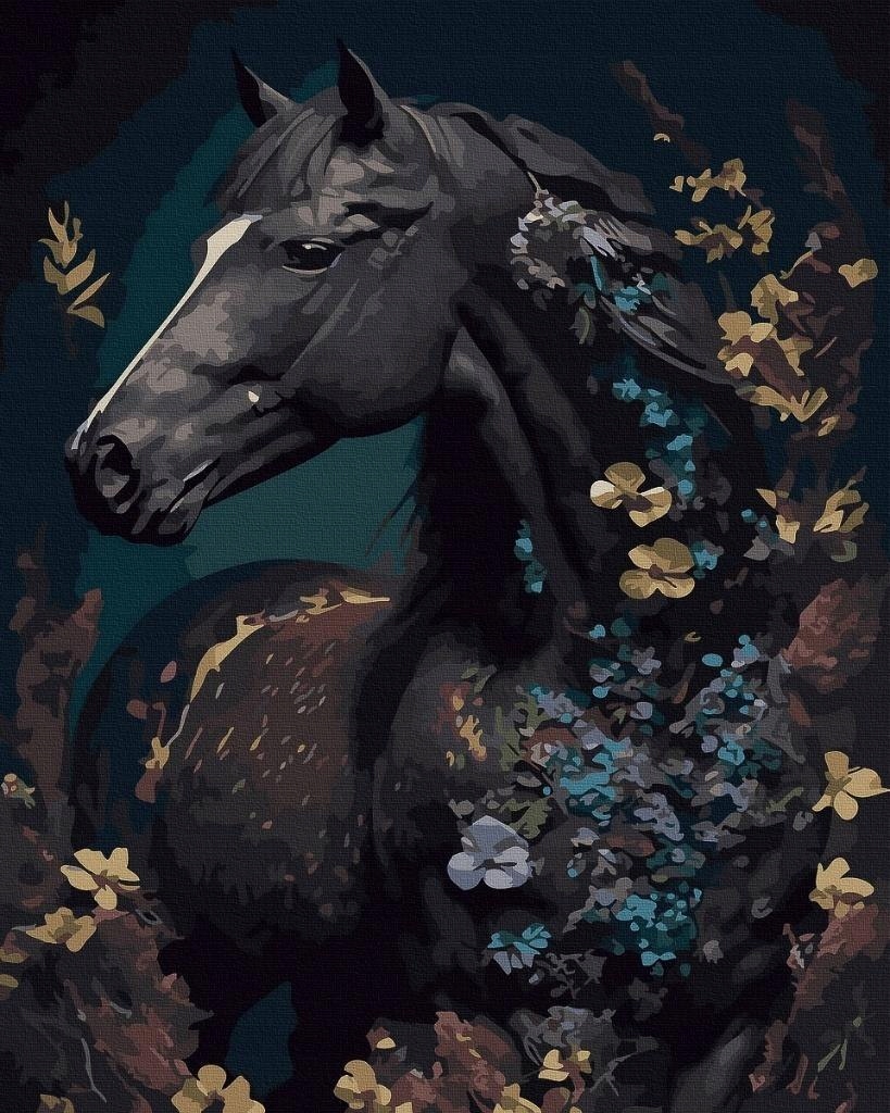 Элегантная лошадь с цветами в гриве на фоне темно -зеленого. Композиция сочетает в себе силу животного с красотой природы.