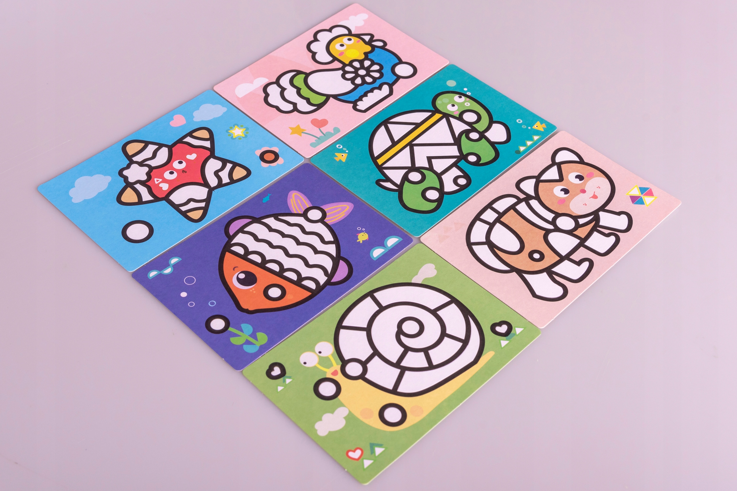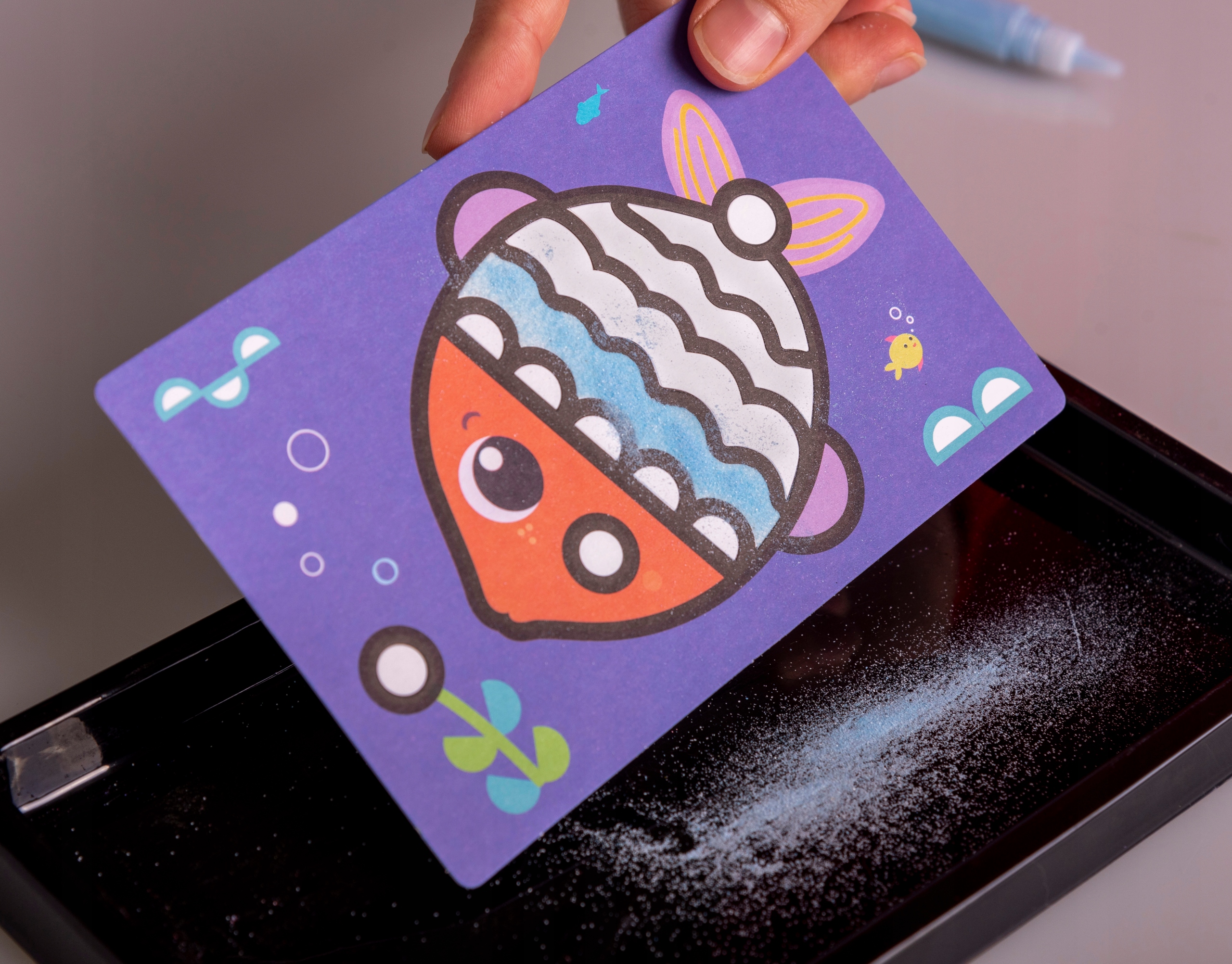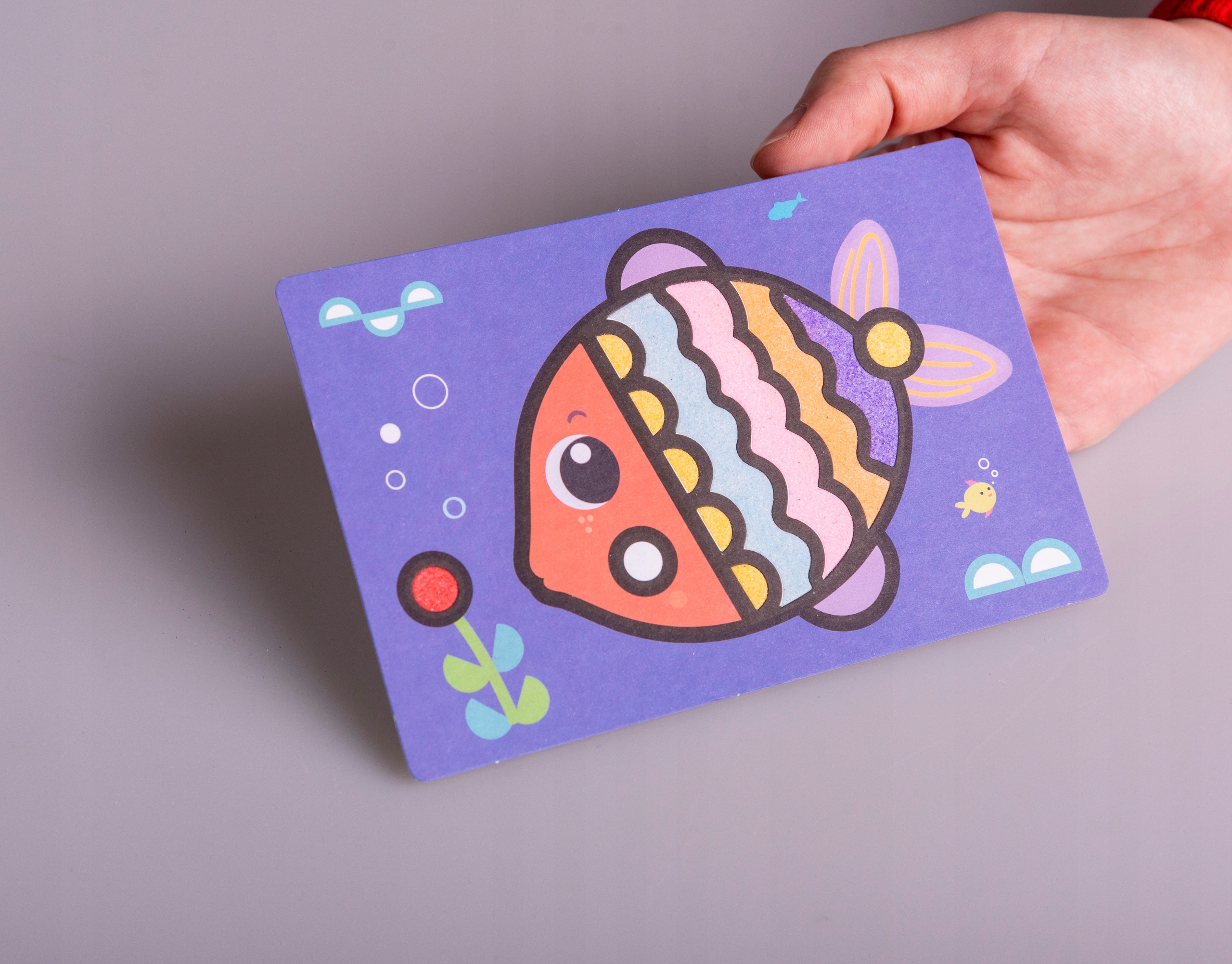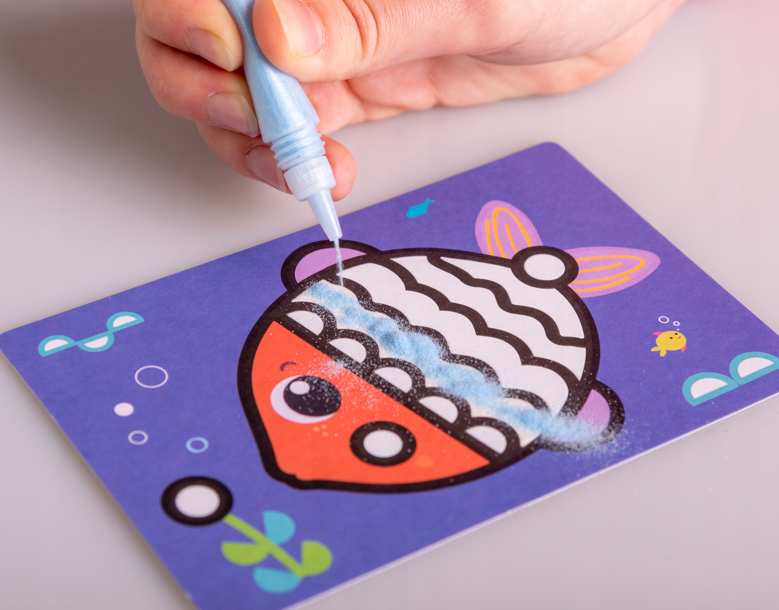 - Картинки содержат поля, покрытые клеем, которые после раскрытия могут быть разбросаны песком и, таким образом, раскрашивать их. Каждая картина - это еще одна возможность выбрать самые интересные цветовые комбинации!