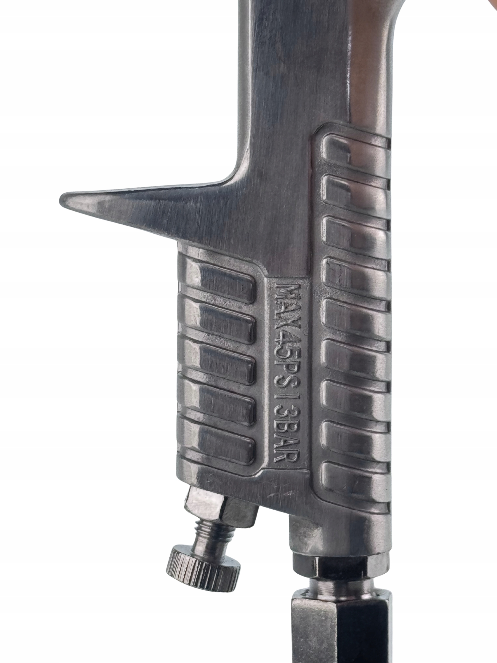 - ручка регулировки в нижней части рукоятки устройства позволяет регулировать количество воздуха, поступающего на сопло пистолета от компрессора.