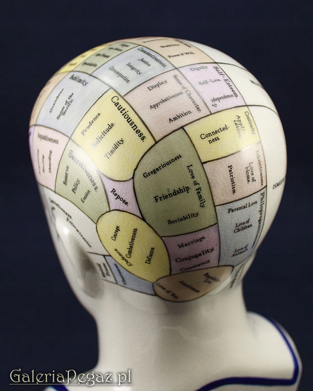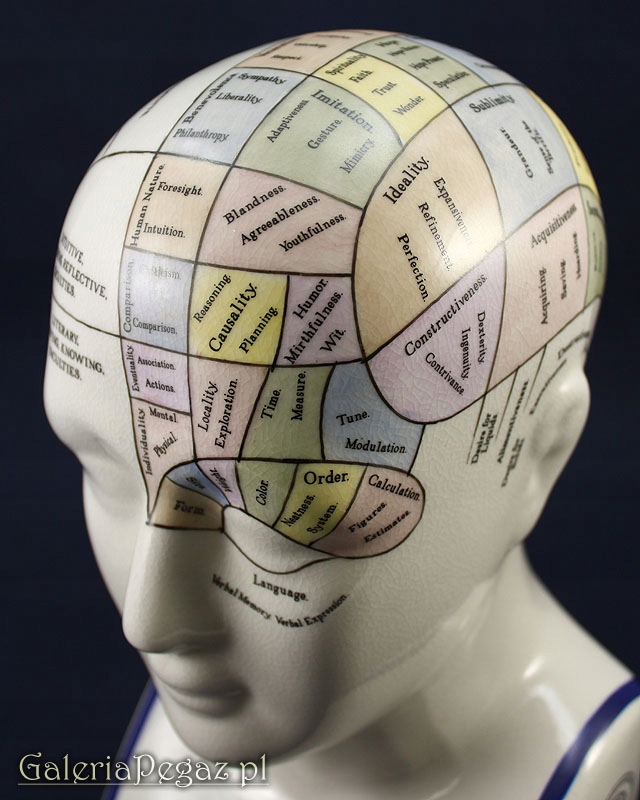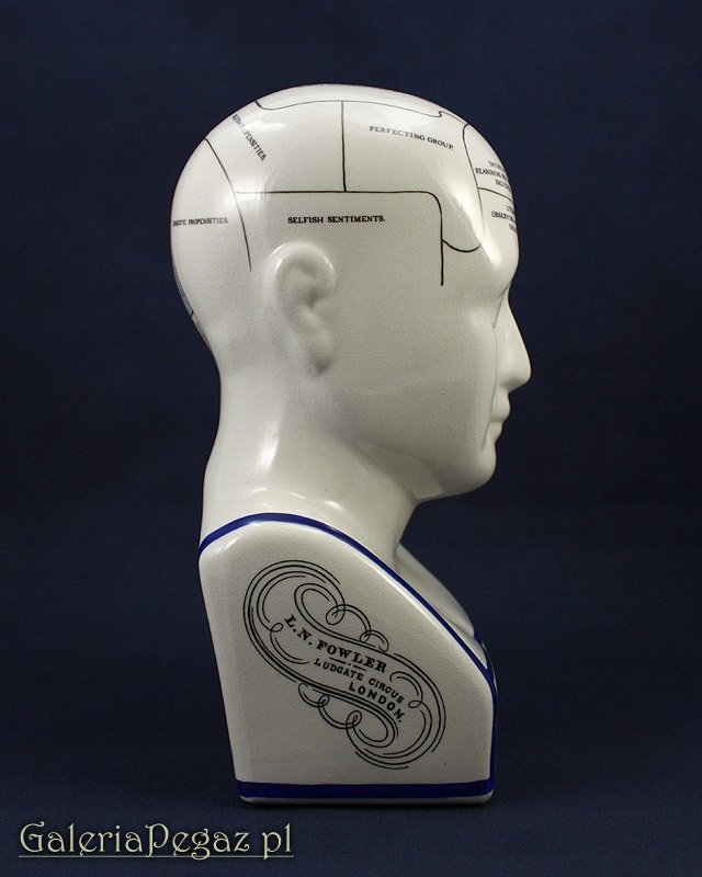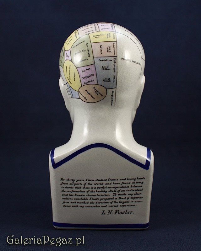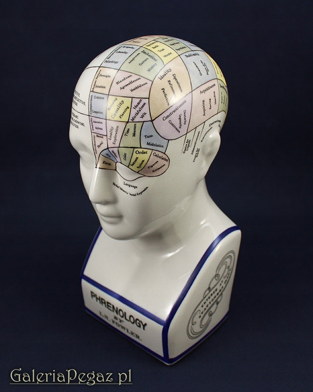 Фарфоровая голова с цветной фреоновой картой в соответствии с. Лоренцо Найлс Фаулер (1811-1896), который утверждал, что человеческий мозг состоит из отдельных органов, и каждый из них отвечает за отдельную врожденную способность, такую как музыкальный слух или воображение.