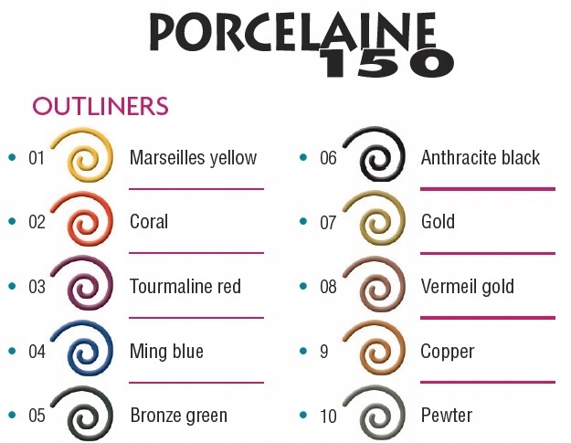 Контурные краски в тюбике с очень тонким и точным дозатором, предназначенные для декорирования фарфора. Устойчив к температуре до 150 градусов Цельсия.