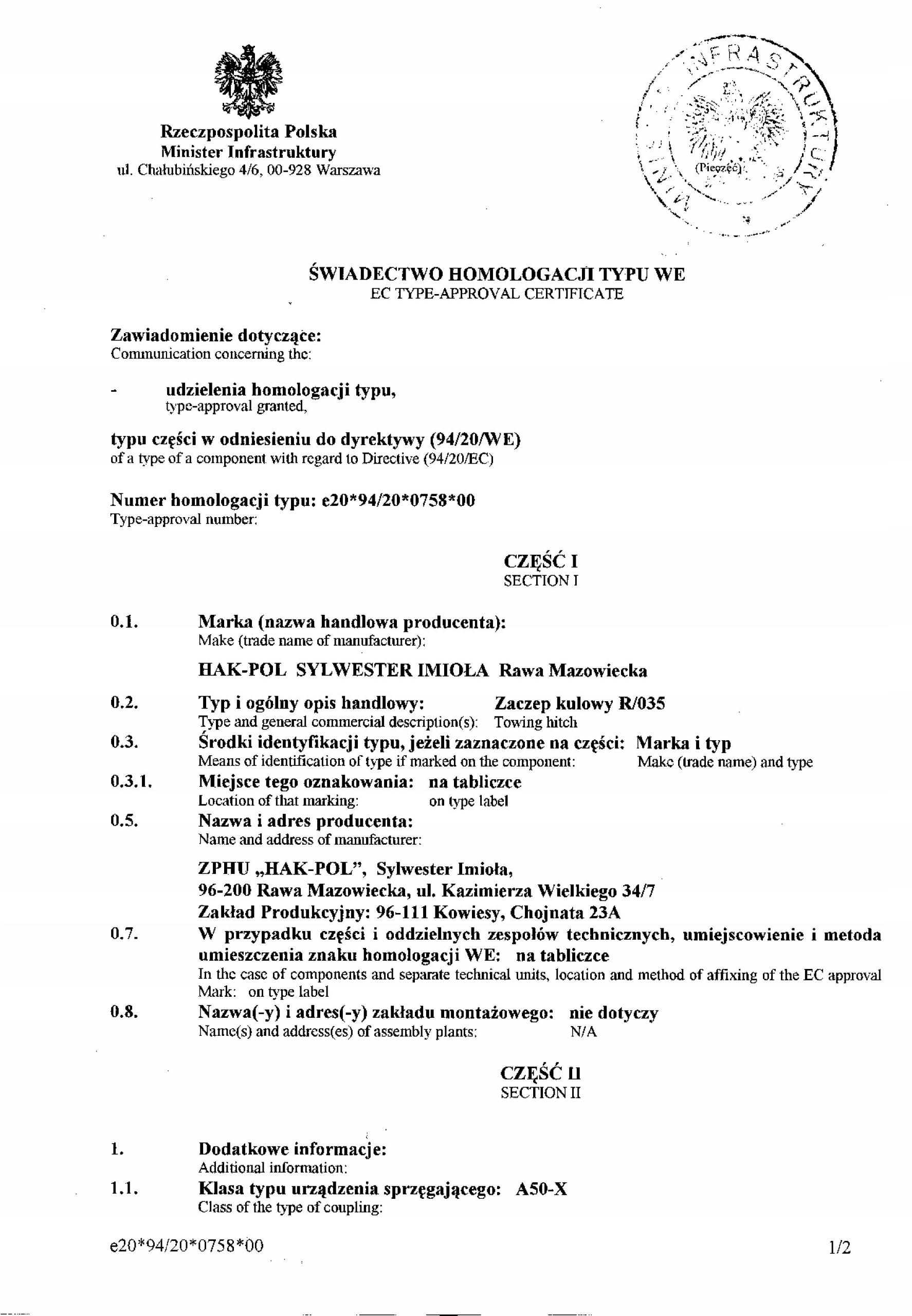 НОВЫЙ КОМПЛЕКТНЫЙ БУКСИРОВОЧНЫЙ КРЮК ОТ ПОЛЬСКОГО ПРОИЗВОДИТЕЛЯ HAK-POL IMIOŁA