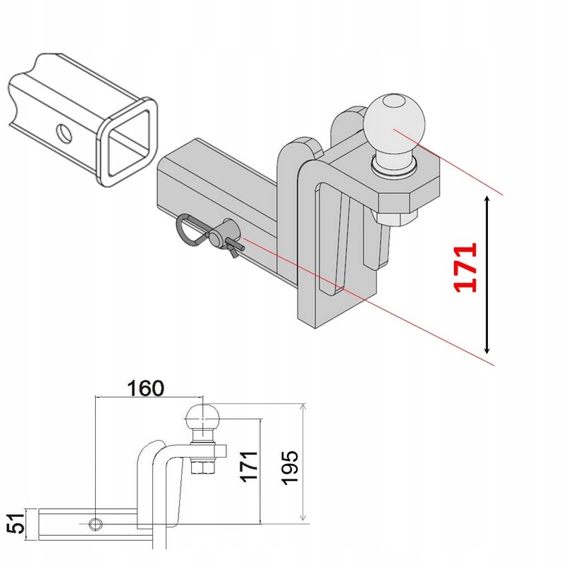 - Высота центра шара: (+171 мм) от центра переходной втулки