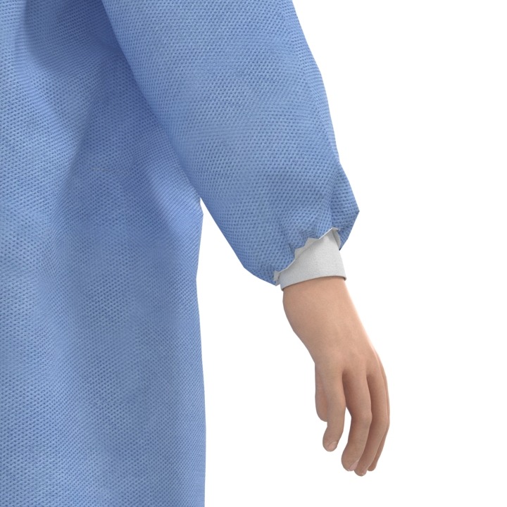 Фартук выполнен из материала СМС, имеет рукава, отделанные эластичными трикотажными манжетами и двойными клапанами сзади, завязанными на талии двойными бретелями. Фартук застегивается на шее на липучку. Материал, используемый для производства, мягкий, дышащий и гидрофобный. Сшиты полиэстеровыми нитками.