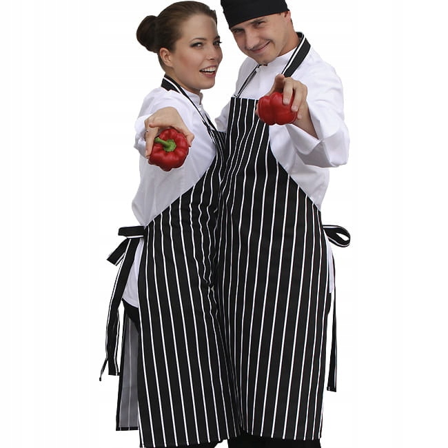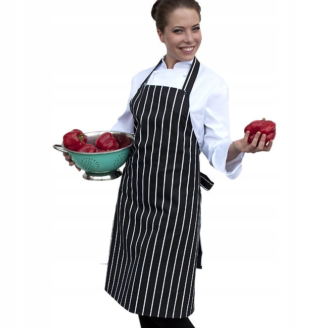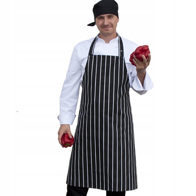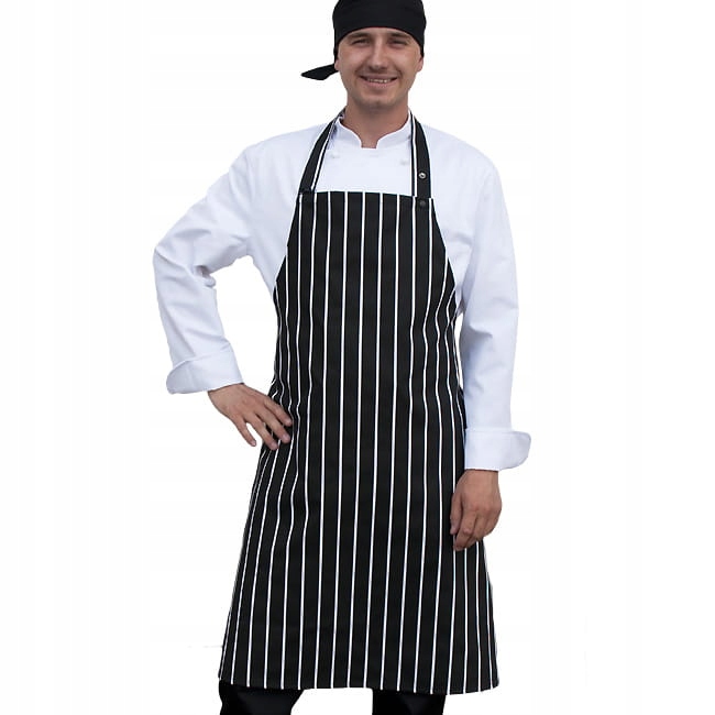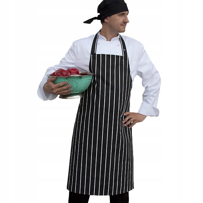 Чрезвычайно прочный и незаменимый фартук с черно-белыми полосками в гастрономии. Фартук прекрасно защищает нижнее белье от загрязнения, обеспечивая при этом высокие эстетические качества. Имеет проверенный крой и регулируемый шейный ремешок.