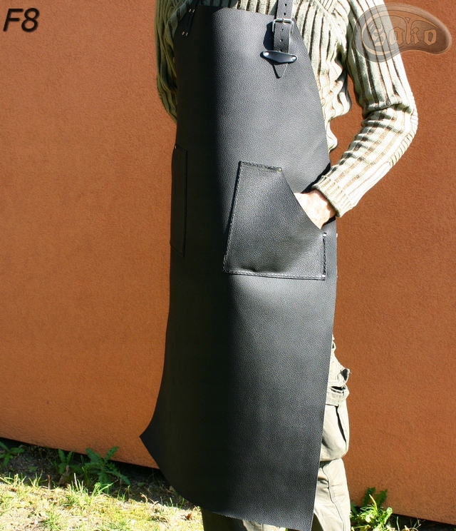 Фартук изготовлен из обтянутой воловьей кожи толщиной 1,6-1,9 мм, термостойкой и высокой устойчивостью к брызгам расплавленного металла благодаря качеству кожи. Фартук соответствует стандартам защитной одежды.