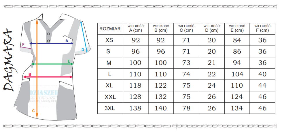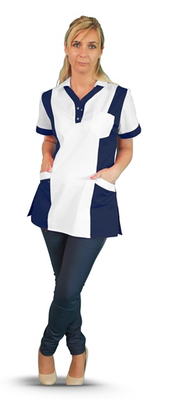 Передняя часть фартука, рукав и спинка всегда белые, а боковые стороны изделия спереди и сзади, а также вставка в вырезе горловины доступны в 17 цветах. цвета.