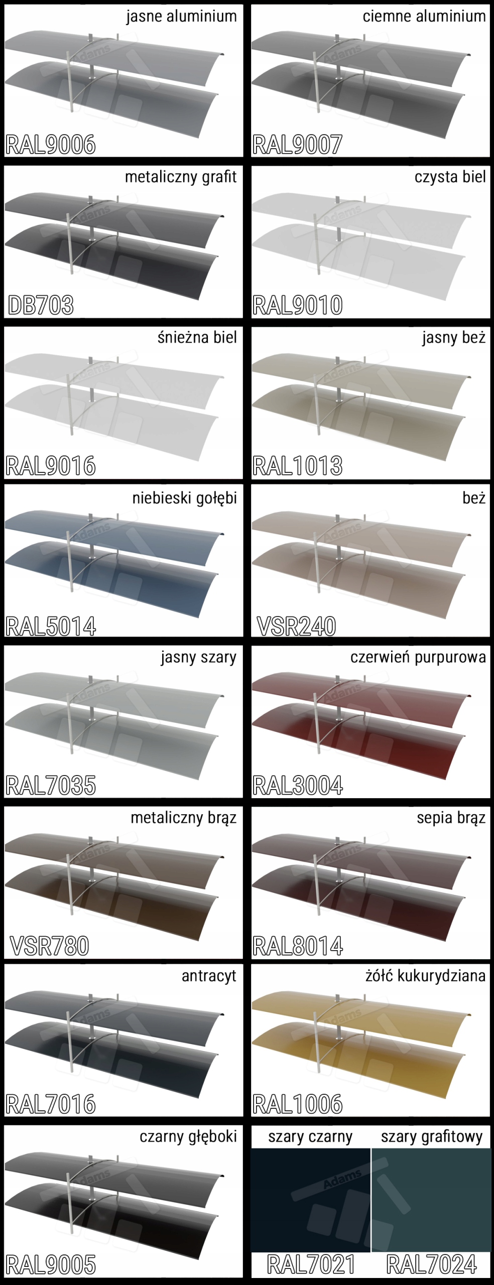 как стандарт без надлежащей платы мы можем выбрать 6 цветов структуры b> в соответствии с палитрой RAL. Цвет конструкции состоит из: направляющих, ручек для руководств, листов крышки, заглушек для листов крышки. Вы можете выбрать из таких цветов: Ral9006 Light Aluminum, Ral9007 Dark Aluminum, Ral7016 антрацит, RAL9010 Pure White, RAL9016 Белоснежка и FSM71319 Маленькая матовая структура, аналогичная графиту.
