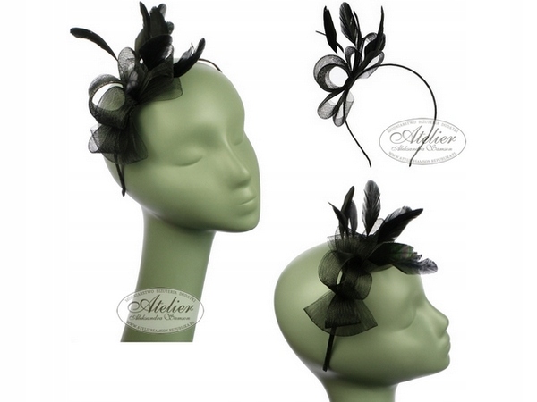 сатиновая полоса, украшенная очарованием синтетического кринолина и перьев. Группа находится на металлической основе, благодаря которой она может быть адаптирована к форме головы. Повязка на голову без зубов.