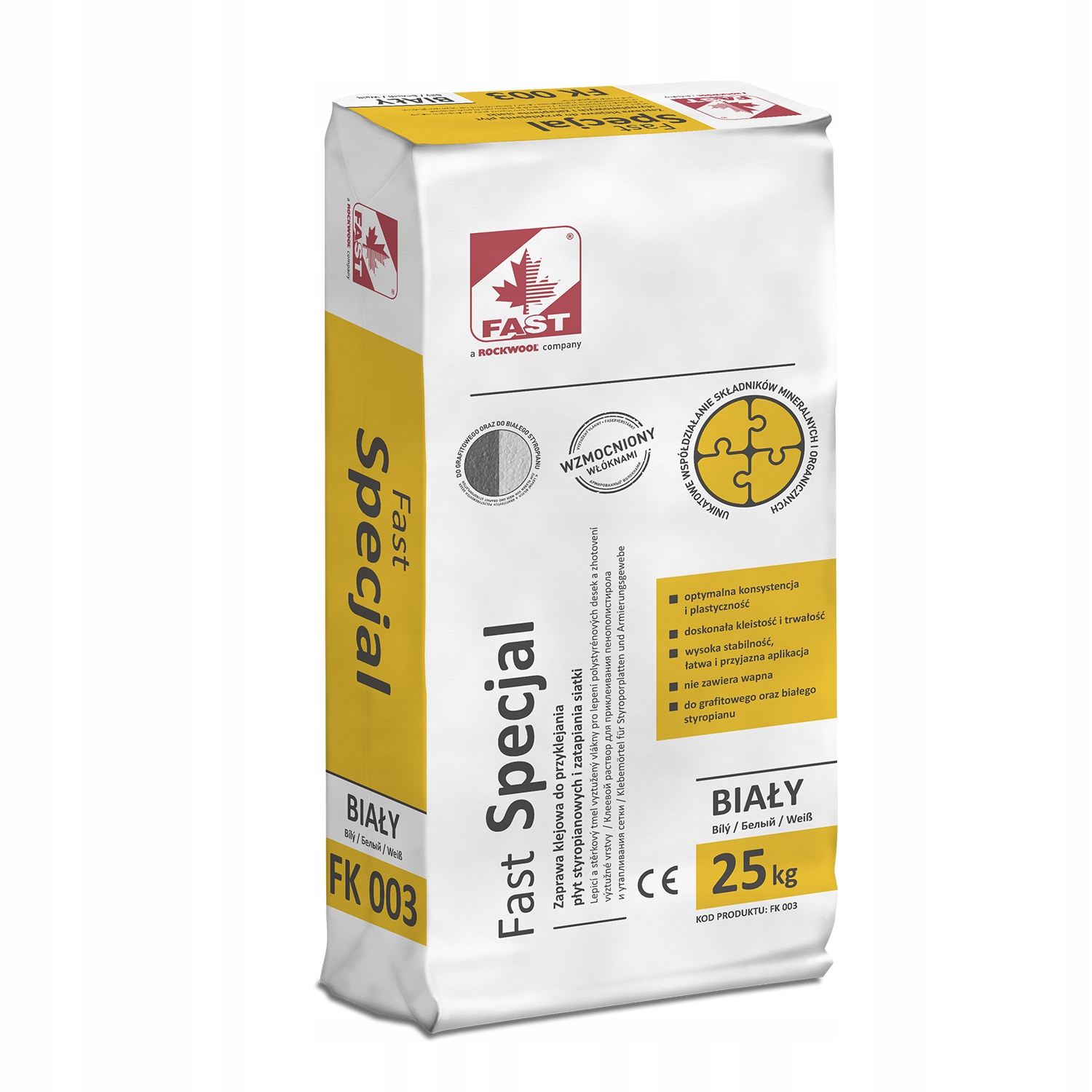 FAST SPECJAL – цементно-полимерный раствор, водо- и морозостойкий, отличающийся высокой паропроницаемостью и устойчивостью к механическим нагрузкам. Благодаря содержанию синтетических волокон имеет повышенную устойчивость к образованию трещин и усадочных трещин. Высокое содержание полимеров и специально подобранная смесь заполнителей гарантируют отличную адгезию к большинству строительных оснований. Клей не содержит свободной извести. Доступные цвета: белый и серый