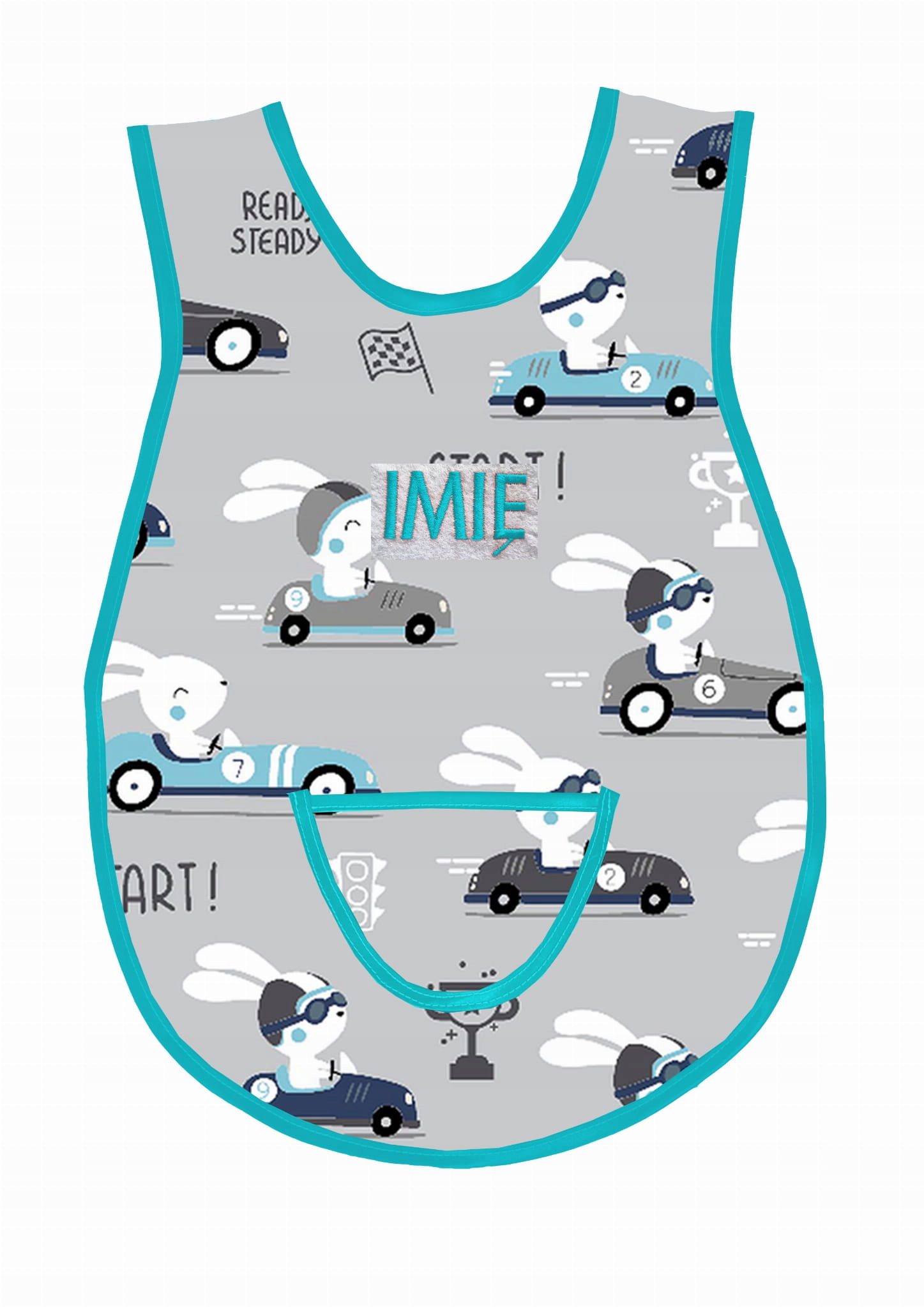 Фартук детского сада — кролик-гонщик на сером фоне — машина wz642