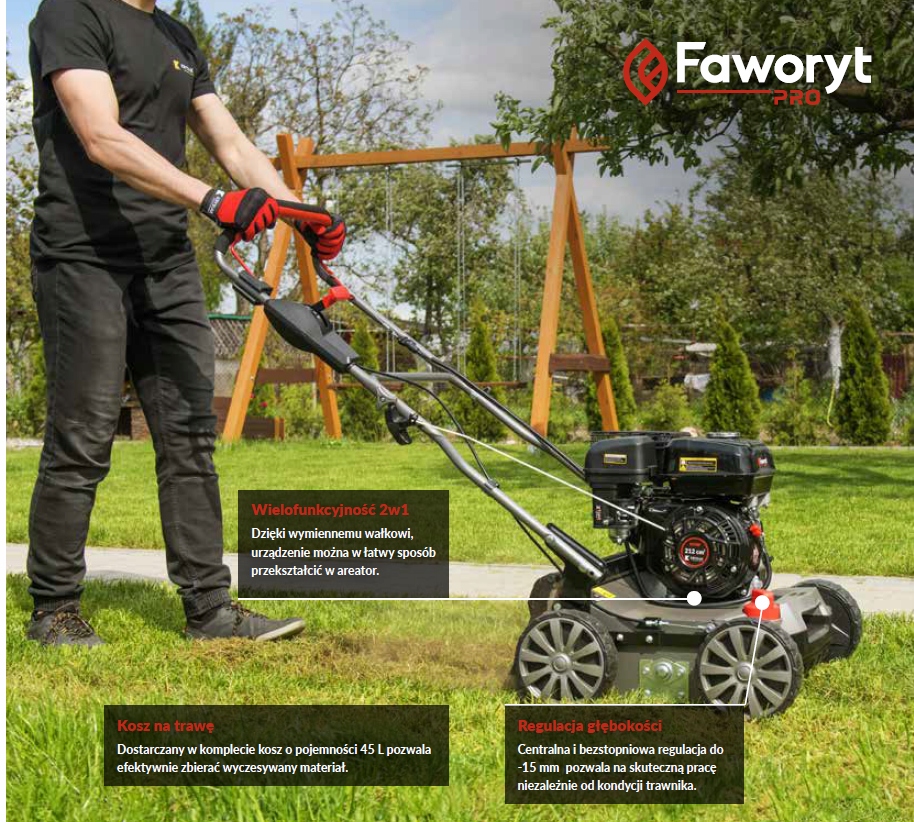 Бензиновый скарификатор FAWORYT GTW40 RP40 — устройство для скарификации и аэрация домашних газонов. К многочисленным преимуществам устройства можно отнести надежный верхнеклапанный двигатель внутреннего сгорания объемом 196 см3, относительно большую рабочую ширину (до 40 см), а также центральную регулировку рабочей глубины (от -15 до 15 мм). Его важнейшая задача — удалить с газона мох, листья и сорняки, а также обработать газон и регенерировать поверхность травы путем скарификации. Для этой цели используются два валика – аэраторный и скарификаторный. На комфорт использования техники влияют и подходящие по размеру колеса с подшипниками.