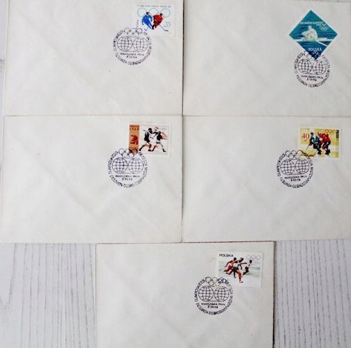 Условие: хорошее Описание: Набор из пяти конвертов с олимпийскими марками, выпущенными Poczta Polska, и марки в первый день циркуляции (FDC) по случаю 68 -й сессии Международного олимпийского комитета, который произошел 6 июня 1969 года в Warsaw.