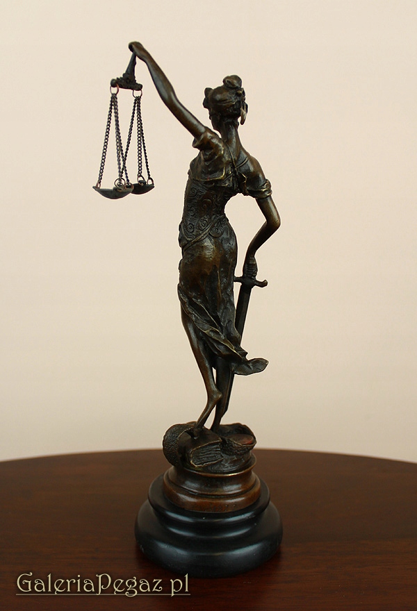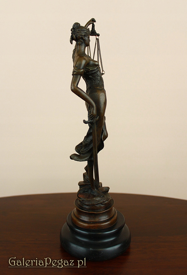 Фигура выполнена очень точно, сохранив все атрибуты греческой богини правосудия - весы, змею, меч и книгу.