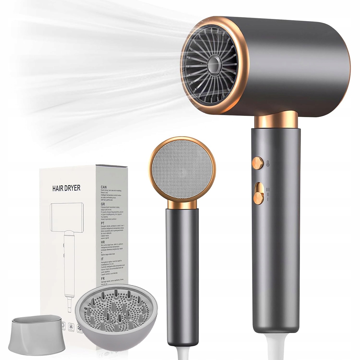 Фен с функцией ионизации, мощность 2400 Вт, кнопка «Холод/Горячо», 3 температуры и 2 скорости, диффузор и концентратор, термостатический фен для дома, путешествий и парикмахерской (серо-золотой)