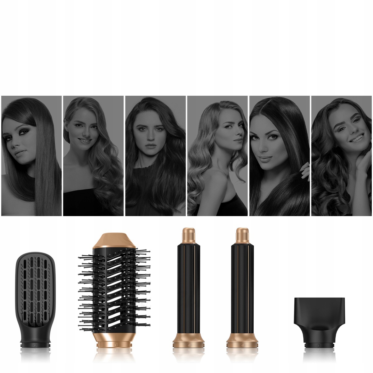 🧡 Универсальная система укладки 5 в 1, состоящая из вращающегося фена мощностью 1000 Вт (60 000 об/мин), щетки для объема, 2 автоматических щипцов для завивки, разглаживающей щетки и насадки-концентратора, подходящей для сушки, выпрямления, завивки, формирования текстуры волос и массажа кожи головы.