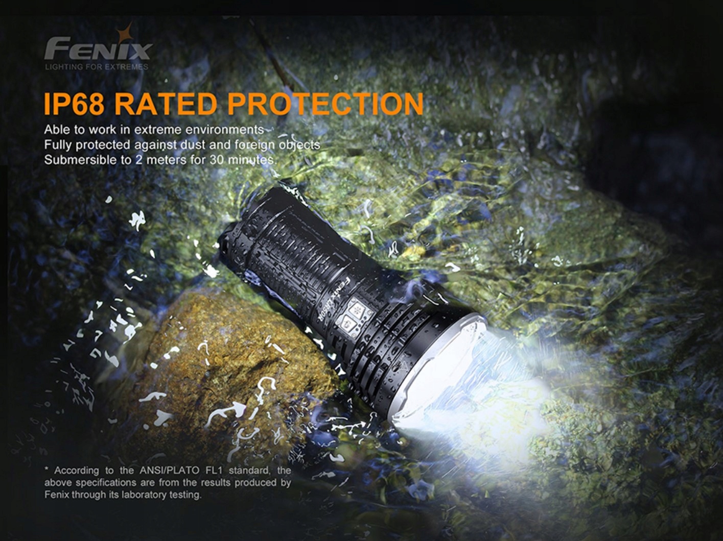 фонарик имеет высокую степень защиты IP68 , что означает, что он полностью устойчив к пыли и пыли, небольшие твердые тела, полное погружение в воду (в течение 30 минут до глубины 2 м) и падает с 1 метра. Fl1 .