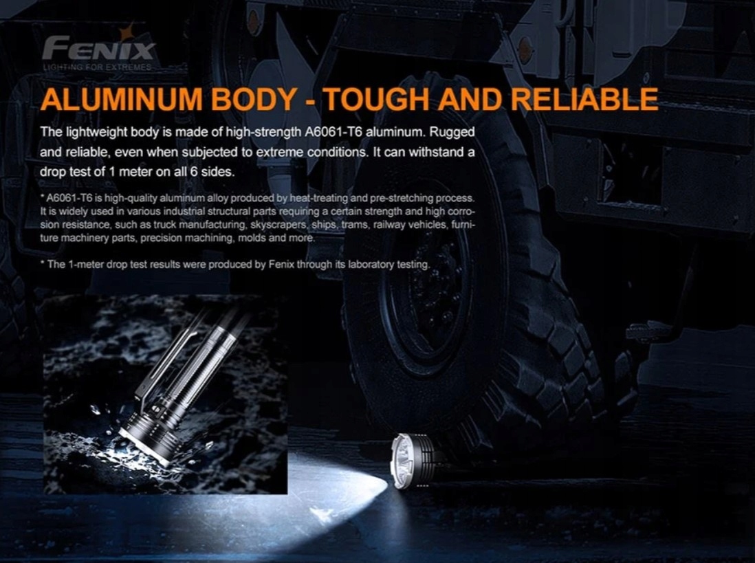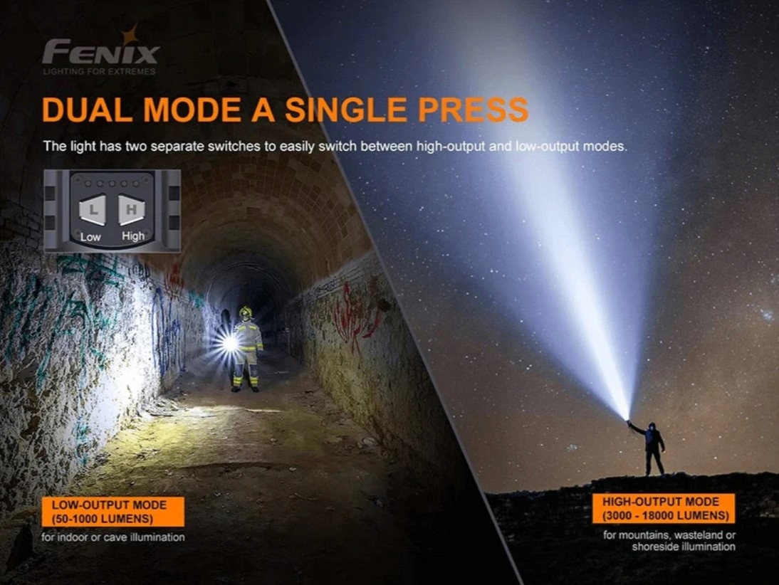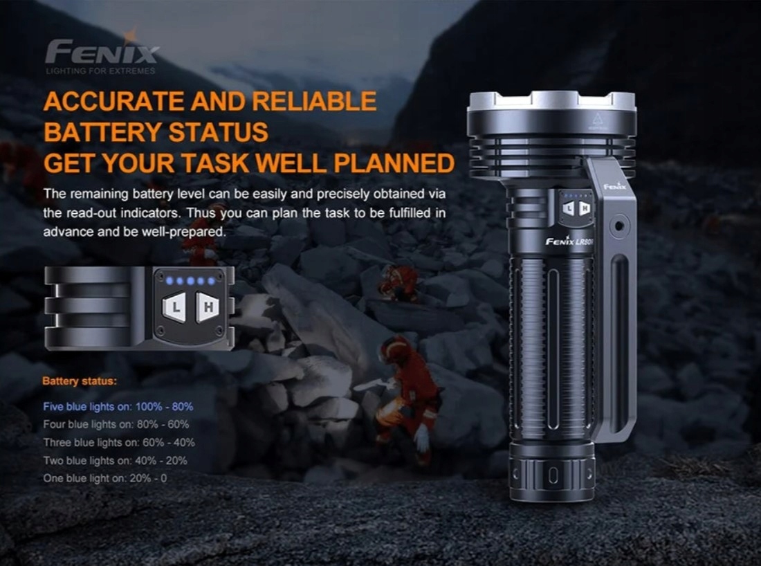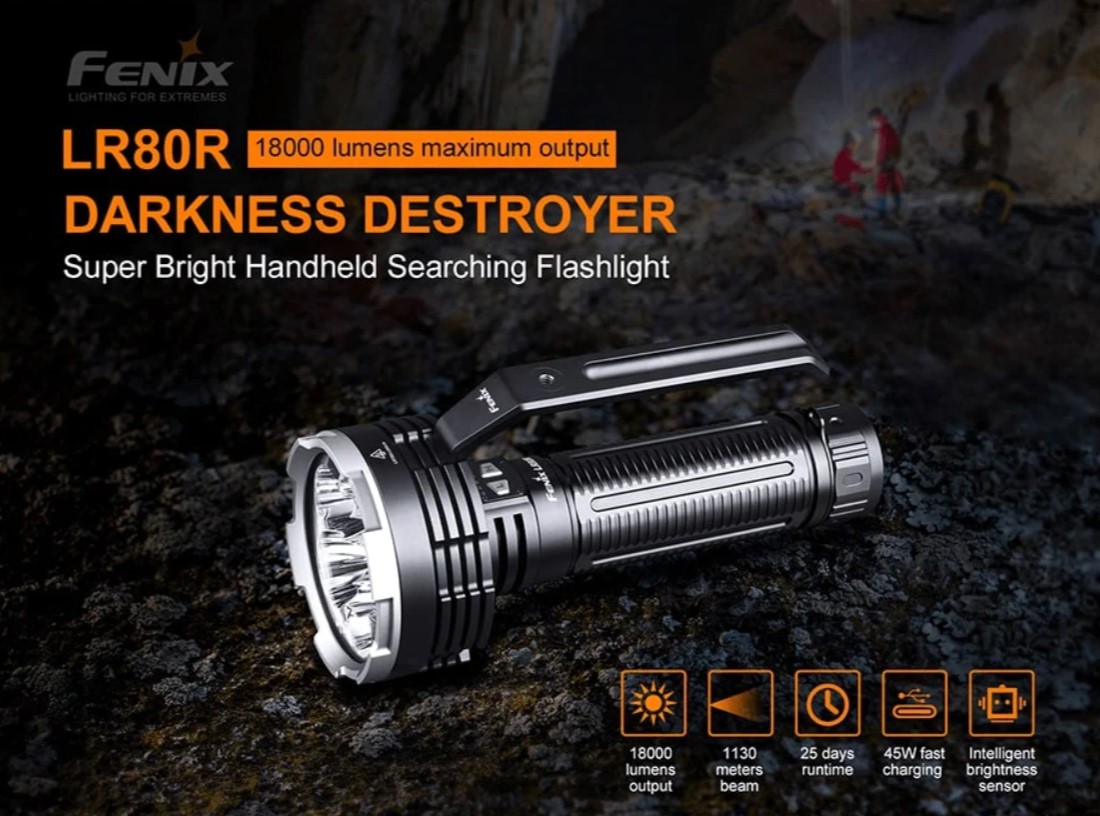 fenix lr80r -самый яркий фонарик Fenix, предназначенный для исследования, спасения и других приложений, требующих мощного диапазона и мощности света. Фонарик fenix lr80r Emits Light Stream 18 000 люмен с диапазоном 1130 м, что составляет до 11 футбольных полей!
