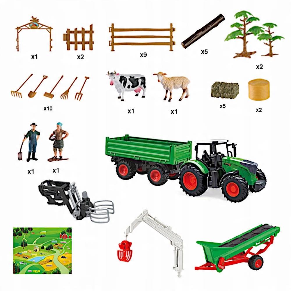 После сборки ручки вы можете начать настоящее веселье, ограниченное только фантазией вашего ребенка. Основным элементом набора является трактор с прицепом, который является незаменимым оборудованием на каждой ферме. Прицеп, прикрепленный к трактору, поднимается и имеет открывающиеся боковые и задние борта, что облегчает выгрузку груза. Отныне перевозка грузов станет проще и приятнее. Дополнительное сельскохозяйственное оборудование с подвижными элементами позволит вашему ребенку почувствовать себя настоящим фермером и облегчит управление сельскохозяйственными работами.
