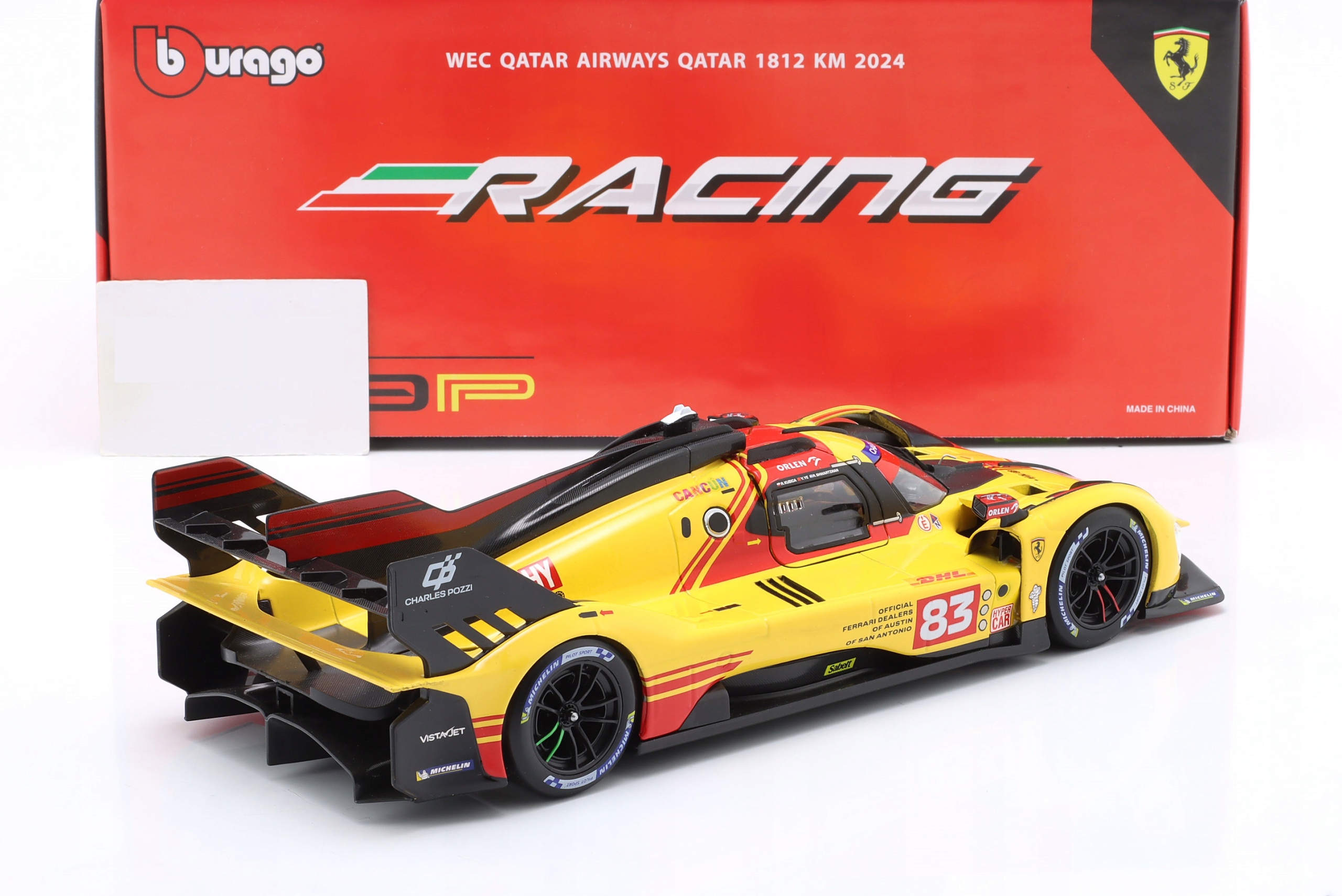 Collector's metal car model - replica - Ferrari 499p 3.0l Turbo V6 #83 4TH WEC QATAR - LMH FIA 24H Le Mans Hypercar - Kubica, Shwartzman, Ye from 2024 on a 1/18 scale produced by Bburago