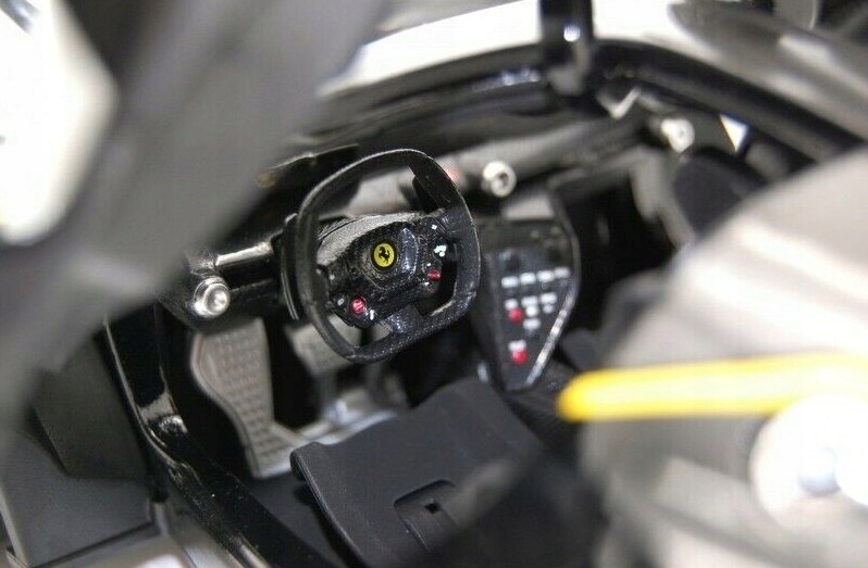 Модель автомобиля Ferrari отличается вниманием к деталям. Имеет подвижные элементы – двери, колеса, крышку двигателя. Полнофункциональная рулевая система.
