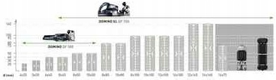 Подходящий дюбель для каждой машины DOMINO: Фуговальный станок DOMINO DF 500 подходит для дюбелей размером от 4x20 мм до 10x50 мм. Фрезер DOMINO XL DF 700 подходит для швов размером от 8x40 мм до 14x140 мм, а также для угловых и плоских поверхностей.