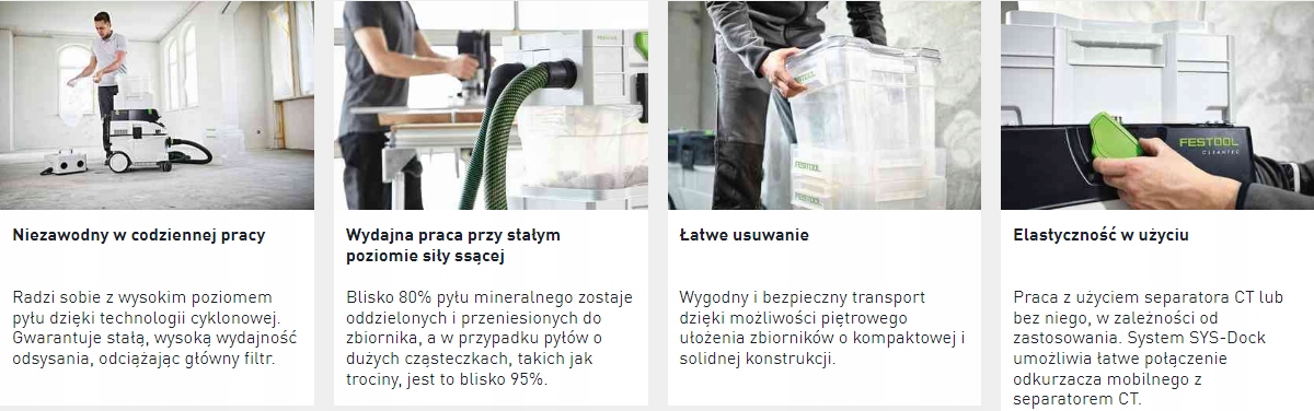 Большое количество пыли и стружки больше не является проблемой для основного фильтра и не создает проблем уменьшить силу всасывания. Сепаратор, совместимый с мобильными пылесосами Festool CT, поглощает до 95 % крупной пыли еще до того, как она попадет в пылесос. Это разгружает основной фильтр и гарантирует постоянную мощность всасывания на протяжении всего рабочего процесса.