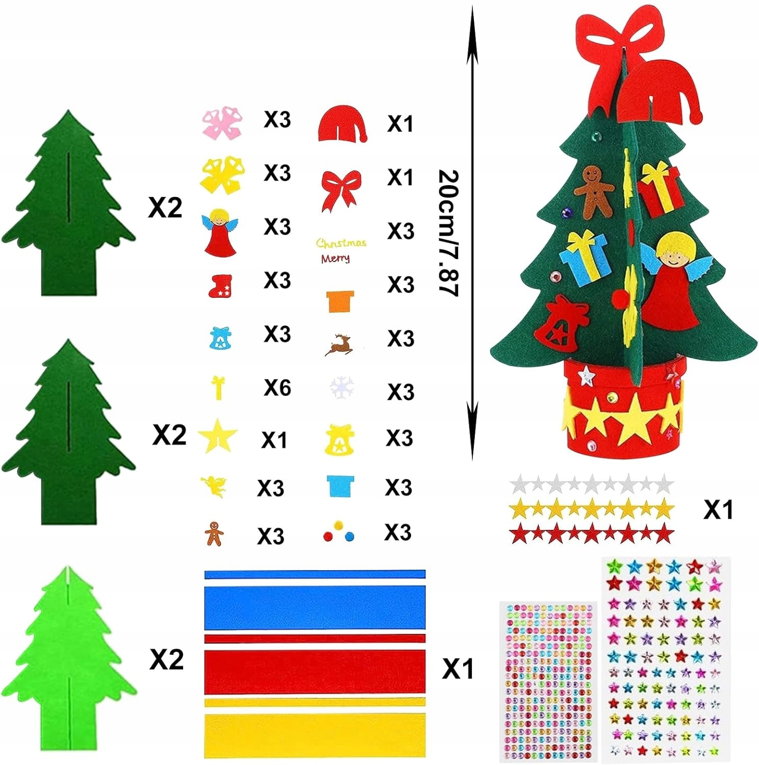 Создайте волшебные рождественские украшения с нашей войлочной елкой для украшения! Набор содержит три рождественских елки, которые дети могут украсить в соответствии с их собственным воображением, используя прикрепленные декоративные элементы.