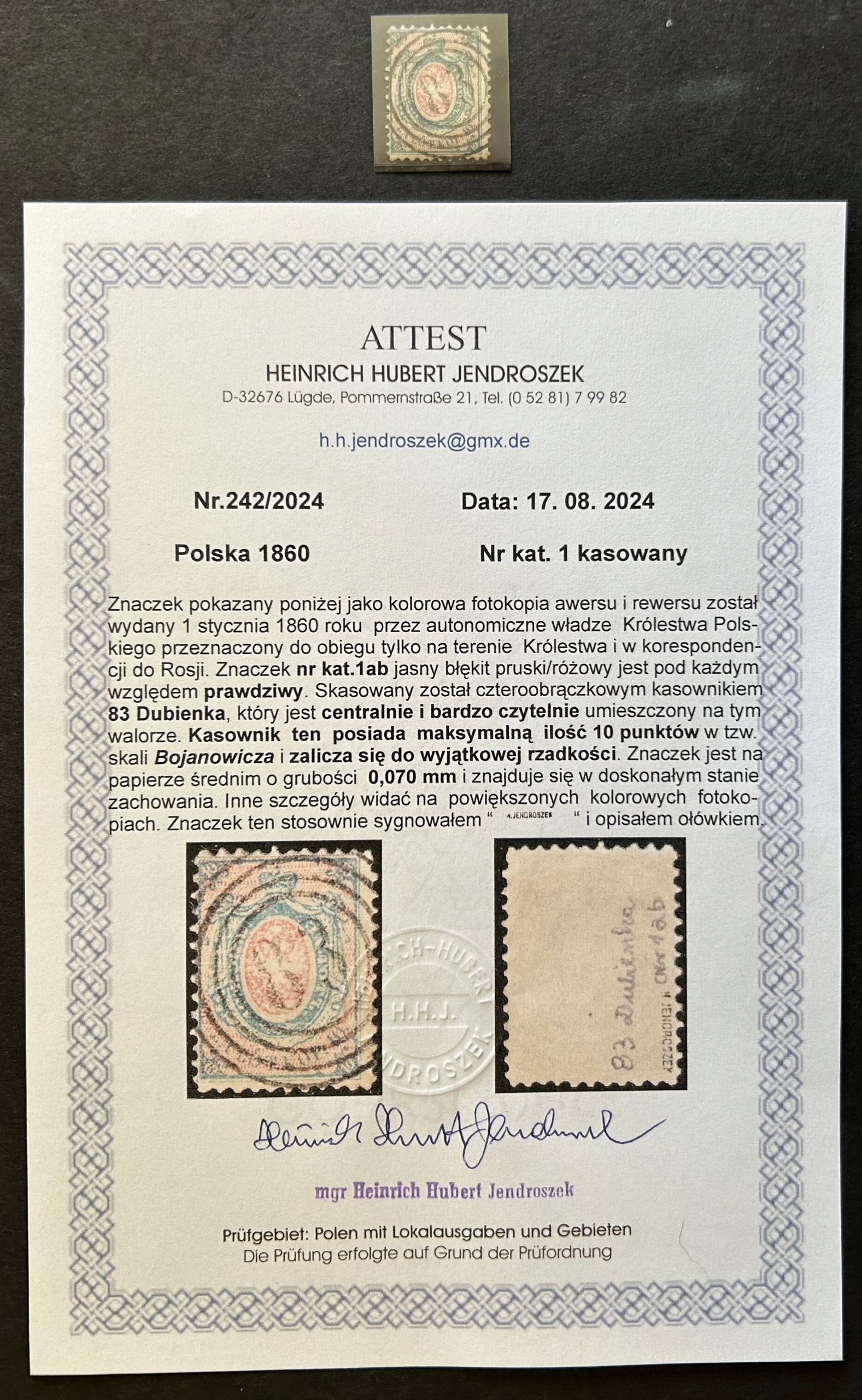 FI 1 ab - СВЕТЛЫЙ ПРУСССКИЙ СИНИЙ РОЗОВЫЙ, КОТОРЫЙ БЫЛ ЧЕТКО И ЦЕНТРАЛЬНО ОТМЕНЕН ЧЕТЫРЕХКОЛЬЦЕВЫМ ОТМЕНОМ № 83 "ДУБЕНКА", ИМЕЮЩИМ 10 БАЛЛОВ ПО ШКАЛЕ М.А. БОЯНОВИЧА (1-ПОПУЛЯРНЫЙ-10 РЕДКИЙ). - ИЗВЕСТНО НЕСКОЛЬКО КОПИЙ) - ОЧЕНЬ РЕДКИЙ ПРЕДМЕТ ПОЛЬСКОЙ ФИЛАТЕЛИИ - СТОИМОСТЬ КАТАЛОГА ПО ФИШЕРУ 2024 ТОМ I - 23 000 ЗЛТЫХ (СТОИМОСТЬ 11 500 + 100% ДОПОЛНИТЕЛЬНАЯ ПЛАТА ЗА ЦЕНТРАЛЬНОЕ ЧТЕНИЕ ОТМЕНЕННОЙ КОРОБКИ И СТОИМОСТИ BDB - (СТР. 42) б> ДЛЯ ОПЛАТЫ ЧЕКОМ ЧЕРЕЗ 7 ДНЕЙ ОТ ДАТЫ ЗАВЕРШЕНИЯ ТОРГОВ, ПОСЛЕ ЭТОГО ПЕРИОДА АУКЦИОН БУДЕТ ОТМЕНЕН И ТОВАР СНОВА БУДЕТ ПРОДАВАТЬСЯ