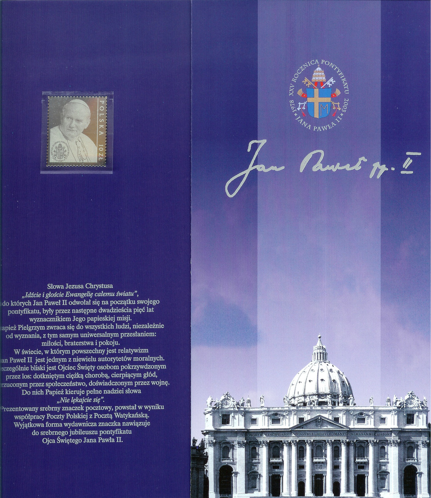 Оплачивая «Фи. 3867** 25-ЛЕТИЕ ПОНТИКАТА ИОАННА ПАВЛА ВТОРОГО Ag», вы можете быть уверены, что данный товар из каталога «2001 - 2010» будет доставлен из Польши и проверен на целостность. В цене товара, указанной на сайте, учтена доставка из Польши. Внимание!!! Товары для Евросоюза, согласно законодательству стран Евросоюза, могут отличаться упаковкой или наполнением.