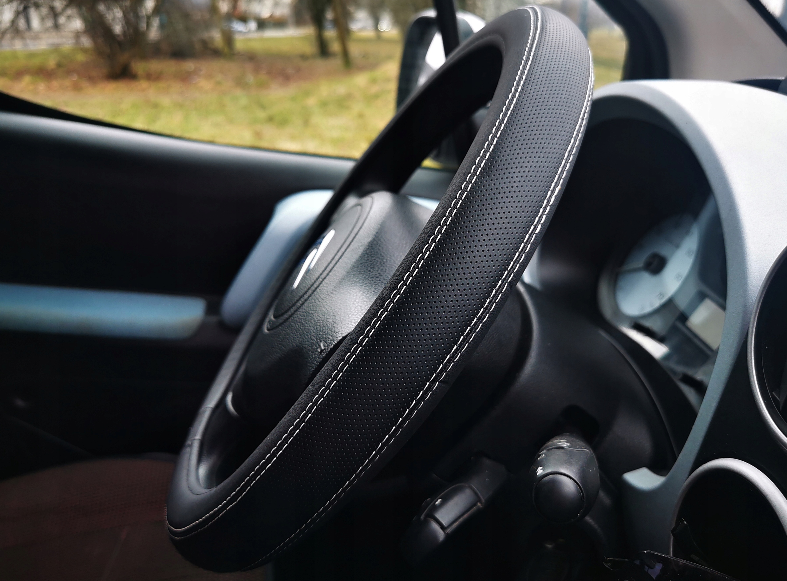 Чехол на руль из высококачественной перфорированной эко-кожи в сочетании с гладкой эко-кожей.