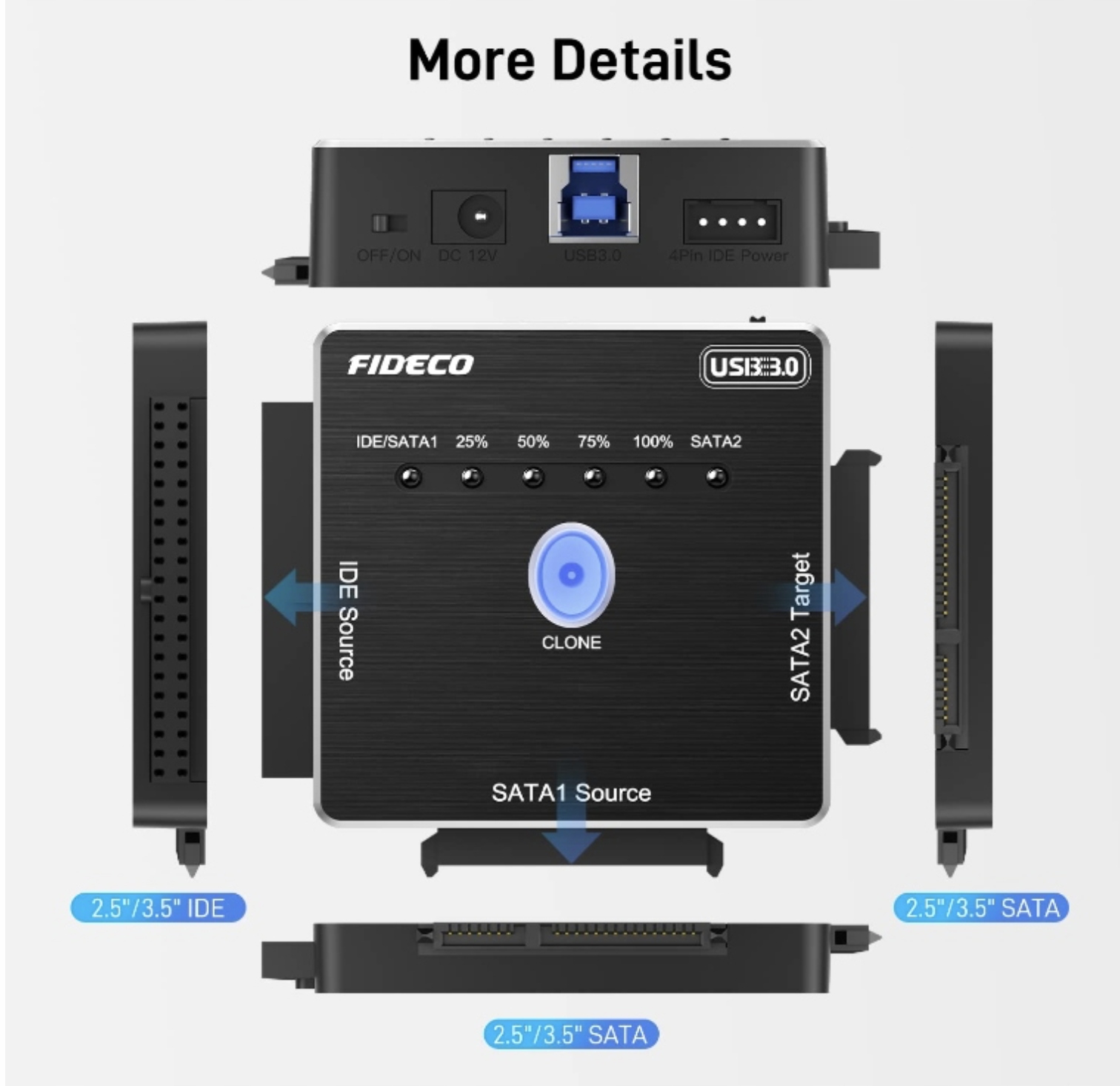 - 【Отличная совместимость】 Адаптер FIDECO IDE и SATA может поддерживать жесткие диски SATA или IDE. Может поддерживать одновременное подключение 2 жестких дисков для передачи данных или автономного клонирования — IDE Source+SATA2 Target; Источник SATA1+Цель SATA2. Обратите внимание, что для передачи данных или автономного клонирования источник IDE и источник SATA1 не могут быть подключены одновременно.