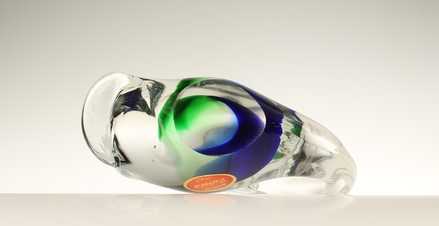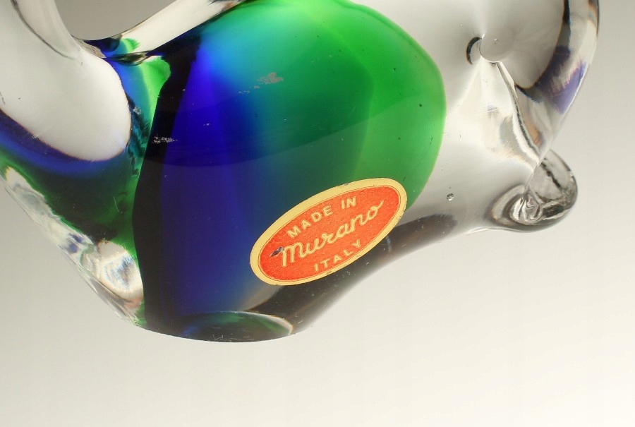 Стеклянная фигурка в форме кита/пресс-папье. Внутренняя часть корпуса украшена взаимопроникающими пятнами: зелеными и синими. Муранское стекло. 2-я половина 20 век