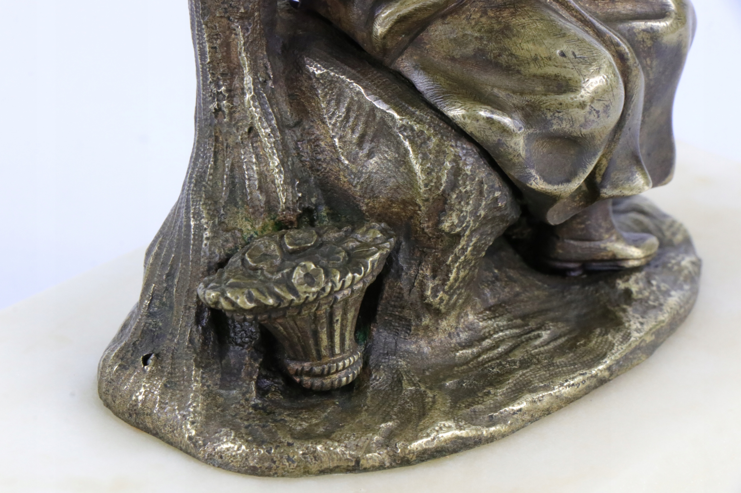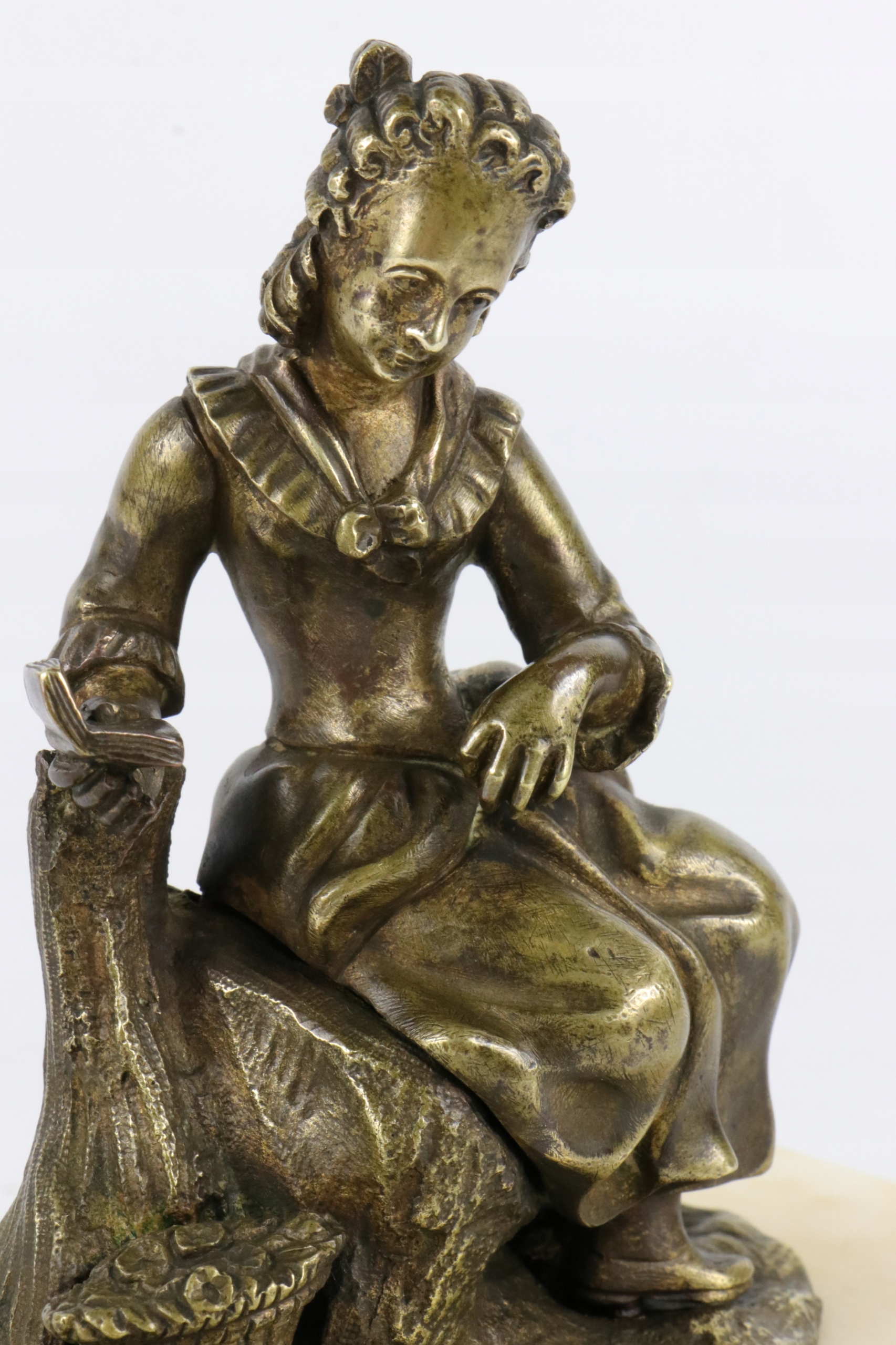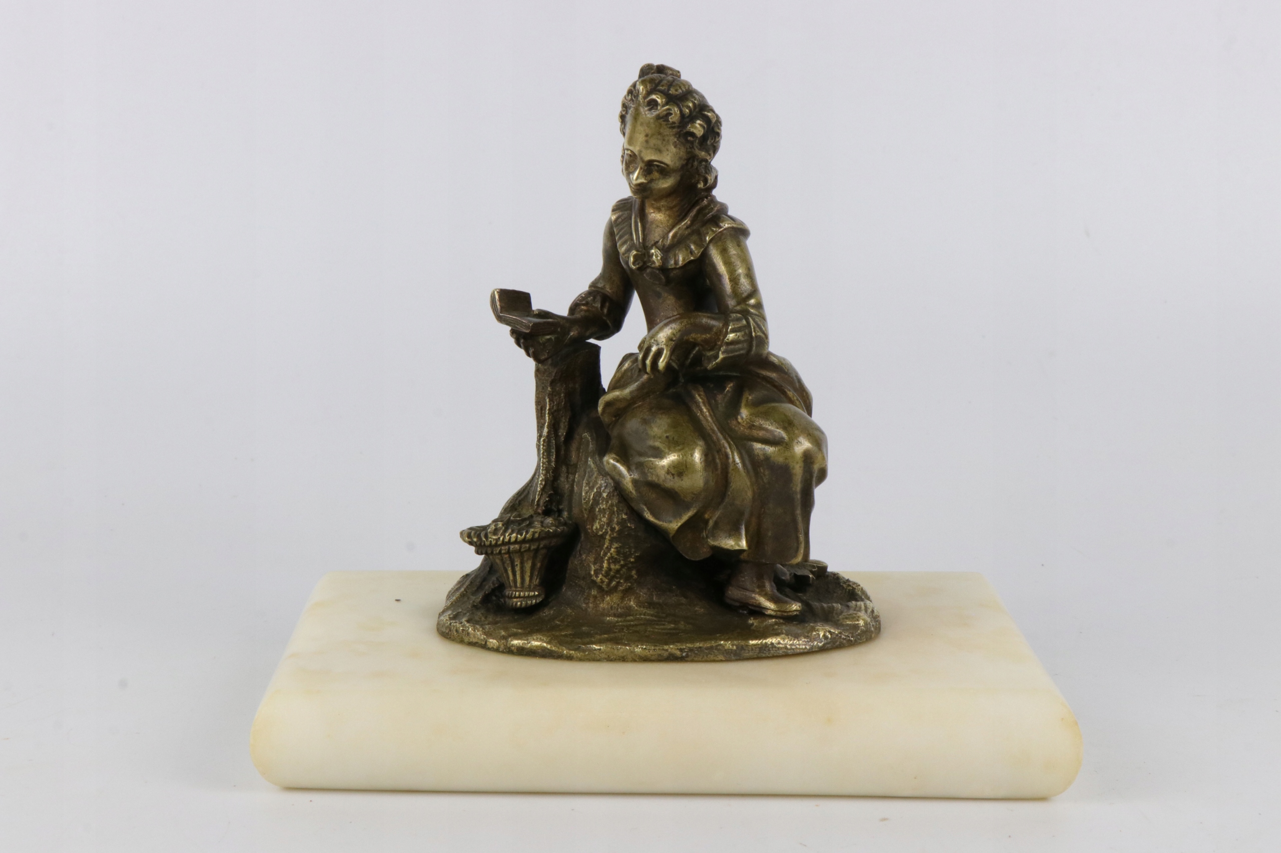 Очень старая бронзовая отливка статуэтки молодой женщины, читающей книгу. Бронза в стиле французского рококо. По-моему, актерский состав середины 19 века, примерно 1850 года. Чрезвычайно точная работа, все детали очень хорошо отлиты. Основание из белого мрамора. Бронза состоит из трех соединенных между собой элементов. Рисунок не подписан.